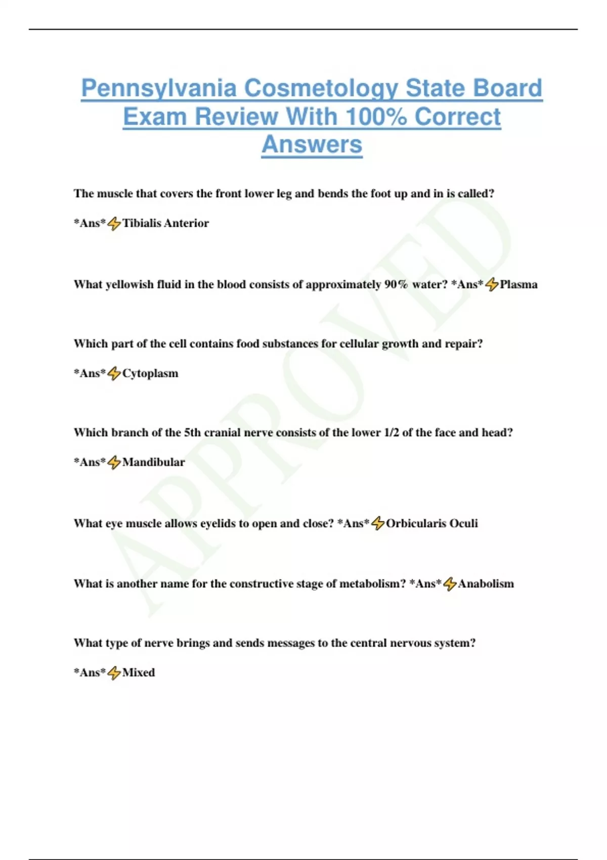 Pennsylvania Cosmetology State Board Exam Review With 100% Correct Answers The muscle that covers the front lower leg and bends the foot up and in is called? *Ans* Tibialis Anterior What yellowish fluid in the blood consists of approximately 90% water? *Ans* Plasma Which part of the cell contains food substances for cellular growth and repair? *Ans* Cytoplasm Which branch of the 5th cranial nerve consists of the lower 1/2 of the face and head? *Ans* Mandibular What eye muscle allows eyelids to open and close? *Ans* Orbicularis Oculi What is another name for the constructive stage of metabolism? *Ans* Anabolism What type of nerve brings and sends messages to the central nervous system? *Ans* Mixed What part of the hand is best used for massage? *Ans* Cushions of fingertips The nerve that carries impulses along the top of the foot to the skin is called? *Ans* Dorsal nerve Where is the location of the ear muscle auricularis anterior? *Ans* Front of the ear Which nerve is located on the little finger side of the arm, extending into the palm of the hand? *Ans* Ulnar nerve Which end of the muscle is attached to an immovable section of skeleton? *Ans* Origin What is produced when a motor nerve point is included in massage? *Ans* Relaxation The muscles in the hand that draw the fingers together are called? *Ans* Adductor Which artery delivers blood to the upper eyelids and forehead? *Ans* Frontal artery Which type of muscle is smooth and responsible for involuntary movements? *Ans* Non-striated muscl