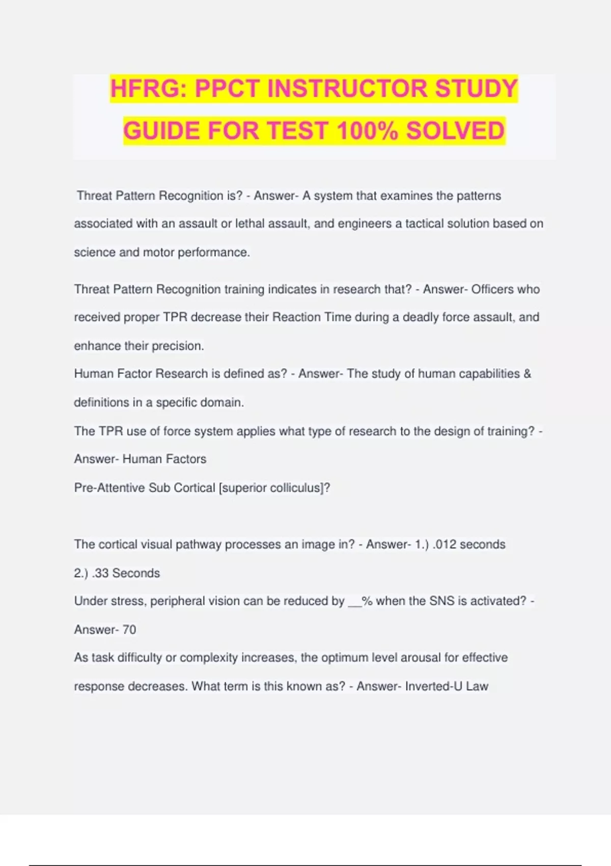 HFRG: PPCT INSTRUCTOR STUDY GUIDE FOR TEST 100% SOLVED Threat Pattern Recognition is? - Answer- A system that examines the patterns associated with an assault or lethal assault, and engineers a tactical solution based on science and motor performance. Threat Pattern Recognition training indicates in research that? - Answer- Officers who received proper TPR decrease their Reaction Time during a deadly force assault, and enhance their precision. Human Factor Research is defined as? - Answer- The study of human capabilities & definitions in a specific domain. The TPR use of force system applies what type of research to the design of training? - Answer- Human Factors Pre-Attentive Sub Cortical [superior colliculus]? The cortical visual pathway processes an image in? - Answer- 1.) .012 seconds 2.) .33 Seconds Under stress, peripheral vision can be reduced by __% when the SNS is activated? - Answer- 70 As task difficulty or complexity increases, the optimum level arousal for effective response decreases. What term is this known as? - Answer- Inverted-U Law Human Factors is? - Answer- the study of human capabilities and human limitations in a specific domain. High-Risk Human Factors is defined as? - Answer- The study of human capabilities and limitations in a high risk environment that is dynamic (chaotic), fluid (uncertain), time compressed and life threatening. Officers feloniously killed with firearm: Distance - Answer- 0-5 Feet: 51.9% 6-10 Feet: 19.2% 0-10 Feet: 71.1% In Siddle's follow-up to Hontz's study regarding assailant response time, he found? - Answer- Assailant movement speed was .37 seconds. Siddle also found officer response time from the holster was 1.9 seconds without aiming, 2.4 seconds when aiming. The four components of Acceptability? - Answer- 1.)Tactical 2.)Legal 3.)Medical 4.) Human Factors Research Mental States in Combat - Answer- 1.) Combat Anxiety 2.) Survival Stress 3.) Combat Stress "The anticipation of danger", this application may lead to a gradual deterioration of both mental and physical skills. - Answer- Combat Anxiety "Deadly force threat perception that initiates the SNS discharge," the associated physiological changes can affect performance. - Answer- Survival Stress The post event mental and physiological symptoms that are a result of the SNS activation and the sudden return to the Parasympathetic Nervous System (PNS) "backlash," which may distort the memory. - Answer- Combat Stress The Autonomic Nervous System? - Answer- A part of the peripheral nervous system and it controls many organs and muscles within the body. We are often unaware of the workings of this type of system and it controls many organs and muscles within the body. the ANS is divided into? - Answer- The Sympathetic Nervous System (SNS) The Parasympathetic Nervous System (PNS) Which system within the Autonomic Nervous system is responsible for the "flight or flee?" (uses more energy, blood pressure increases, heart beats faster, pupils dilate and digestion slows. - Answer- Sympathetic Nervous System When activated what system will make the heart beat slower and with less force, the pupils will constrict, mucus production increases and digestion can start? (pupils constrict, blood pressure decreases, heart rate slows, mucus production increases and digestion can start. - Answer- Parasympathetic Nervous Sysetm Four triggers that activate the SNS? - Answer- 1.) Objective Threat Perceptions 2.) Objective Fear Perceptions 3.) Physical Exhaustion 4.) Startle Response Four triggers that activate the SNS?