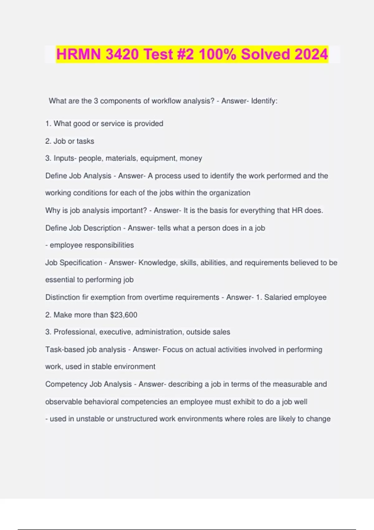 HRMN 3420 Test #2 100% Solved 2024 What are the 3 components of workflow analysis? - Answer- Identify: 1. What good or service is provided 2. Job or tasks 3. Inputs- people, materials, equipment, money Define Job Analysis - Answer- A process used to identify the work performed and the working conditions for each of the jobs within the organization Why is job analysis important? - Answer- It is the basis for everything that HR does. Define Job Description - Answer- tells what a person does in a job - employee responsibilities Job Specification - Answer- Knowledge, skills, abilities, and requirements believed to be essential to performing job Distinction fir exemption from overtime requirements - Answer- 1. Salaried employee 2. Make more than $23,600 3. Professional, executive, administration, outside sales Task-based job analysis - Answer- Focus on actual activities involved in performing work, used in stable environment Competency Job Analysis - Answer- describing a job in terms of the measurable and observable behavioral competencies an employee must exhibit to do a job well - used in unstable or unstructured work environments where roles are likely to change Define Job Design - Answer- the process of identifying tasks that each employee is responsible for completing, as well as how those takes will be accomplished Define Job Redesign - Answer- refers to changing the tasks or the way work is performed in an existing job Define HR Forecasting/Planning - Answer- Identifies the estimated supply and demand for the different types of human resources in the organization over some future period, based on analysis of past and present demand. - methods can be quantitative or qualitative External Forecasting Determinants (4) - Answer- -economic condition -labor markets -technology -labor unions What forecasts internal availability? - Answer- Markov Analysis Options for labor surplus? - Answer- - downsizing and layoffs - pay reduction -work sharing - natural attrition - hiring freeze -retraining and transfers - early retirement options for labor shortage? - Answer- - overtime -temporary or contract workers - retrain workers - outsourcing -turnover reduction -hire new employees - technology innovation What is succession planning? - Answer- forecasting done to: - have people ready to move into vacated positions -make predictions for leadership requirements over a forecasted time period to either prepare new leaders to take on these positions, or to go out and recruit new people What is the first step on matching employees to specific jobs? - Answer- Recruiting define generation - Answer- strategies that make people in job m
