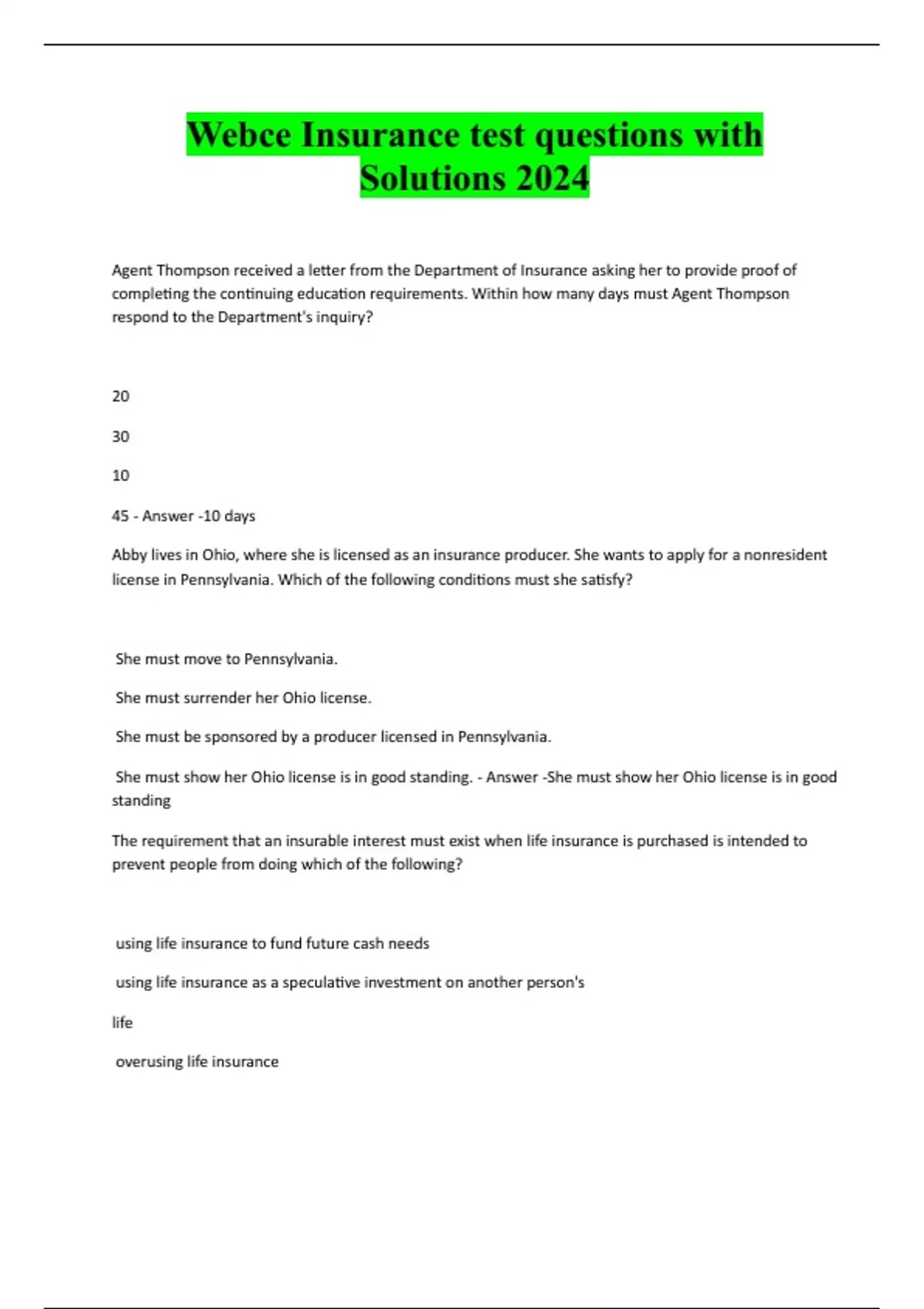 Webce Insurance test questions with Solutions 2024 Agent Thompson received a letter from the Department of Insurance asking her to provide proof of completing the continuing education requirements. Within how many days must Agent Thompson respond to the Department's inquiry? 20 30 10 45 - Answer -10 days Abby lives in Ohio, where she is licensed as an insurance producer. She wants to apply for a nonresident license in Pennsylvania. Which of the following conditions must she satisfy? She must move to Pennsylvania. She must surrender her Ohio license. She must be sponsored by a producer licensed in Pennsylvania. She must show her Ohio license is in good standing. - Answer -She must show her Ohio license is in good standing The requirement that an insurable interest must exist when life insurance is purchased is intended to prevent people from doing which of the following? using life insurance to fund future cash needs using life insurance as a speculative investment on another person's life overusing life insurancedesignating an ineligible person as the policy beneficiary - Answer -using life insurance as a speculative interest on another person's life Which one of the following best describes a policy that has a relatively low face amount and has premiums that are paid to an insurance agent who generally calls on the policyowner at home to collect them? group life insurance industrial life insurance ordinary term insurance ordinary whole life insurance - Answer -industrial life insurance Sylvia's insurer guarantees a fixed death benefit for the policy she owns. Based on this, which one of the following benefits is also most likely guaranteed with this policy? the policy's cash value her ability to borrow an interest-free loan from the cash value policy dividends payment of premiums on Sylvia's behalf in the event of emergencies - Answer -the policy's cash value Carl is a policyowner who prefers to pay premiums monthly rather than annually. How will Carl's insurance company adjust his premium to accommodate this req
