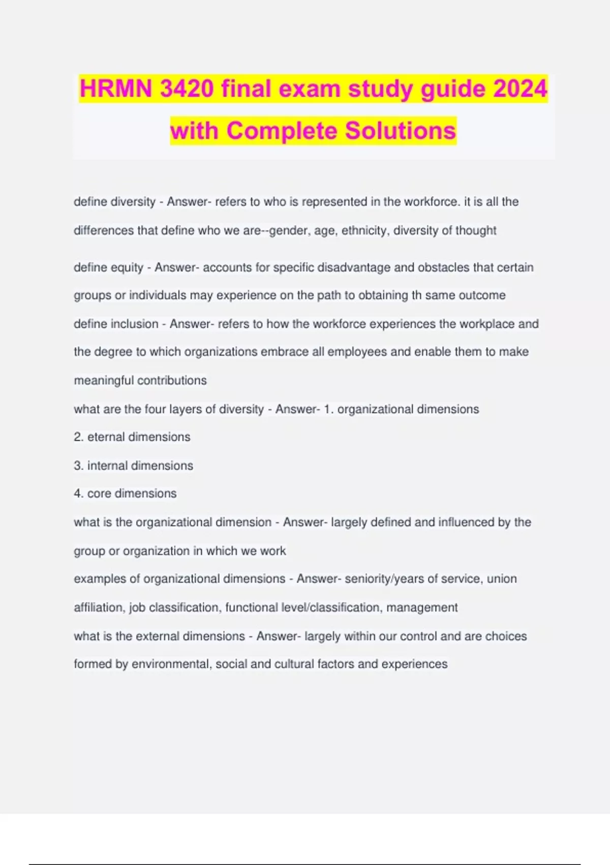 HRMN 3420 final exam study guide 2024 with Complete Solutions define diversity - Answer- refers to who is represented in the workforce. it is all the differences that define who we are--gender, age, ethnicity, diversity of thought define equity - Answer- accounts for specific disadvantage and obstacles that certain groups or individuals may experience on the path to obtaining th same outcome define inclusion - Answer- refers to how the workforce experiences the workplace and the degree to which organizations embrace all employees and enable them to make meaningful contributions what are the four layers of diversity - Answer- 1. organizational dimensions 2. eternal dimensions 3. internal dimensions 4. core dimensions what is the organizational dimension - Answer- largely defined and influenced by the group or organization in which we work examples of organizational dimensions - Answer- seniority/years of service, union affiliation, job classification, functional level/classification, management what is the external dimensions - Answer- largely within our control and are choices formed by environmental, social and cultural factors and experiences examples of external dimensions - Answer- marital status, economic status, faith and spirituality, education, appearance dress, geographic location, social status, parental status, recreational habits what is the internal dimensions - Answer- largely out of our control but have a powerful impact on behaviors and attitudes examples of the internal dimension - Answer- gender, physical ability, race, nationality/ethnicity, sexual orientation, age what is the core dimension - Answer- how we think and communicate what are lagging indicators - Answer- achieve gender and minority representation goals (30% women, 50% salaried women, 30% US salaried women) what are leading indicators - Answer- - improve employee engagement - improve retention of diverse salaried talent - ensure employees develop and demonstrate inclusion and collaboration - ensure diverse talent included in talent pools for succession purposes of an employee compensation philosophy - Answer- 1. identify how the pay programs and strategies support the organization's business strategy 2. attract people to join the organization 3. motivate employees to perform at the best of their competencies, abilities and skill sets 4. retain key talent and reward high-performing employees 5. define how the organization plans to pay and reward competitively, based on business conditions, competition and ability to pay what are the three types of compensation - Answer- 1. base pay -- wages and salaries 2. variable pay -- gainsharing, incentives, commissions, bonus plans 3. differential pay -- holiday pay, weekend pay, hazard pay what does the minimum represent in a salary structure - Answer- entry level; typically 75% of midpoint what does the midpoint represent in a salary structure - Answer- 100 compa-ratio; represents the market rate for a job what does the maximum represent in a salary structure - Answer- represents the cap on a job's value; long tenure or subject matter expert; typically around 124% of midpoint; don't pay above this level--use lump sums instead
