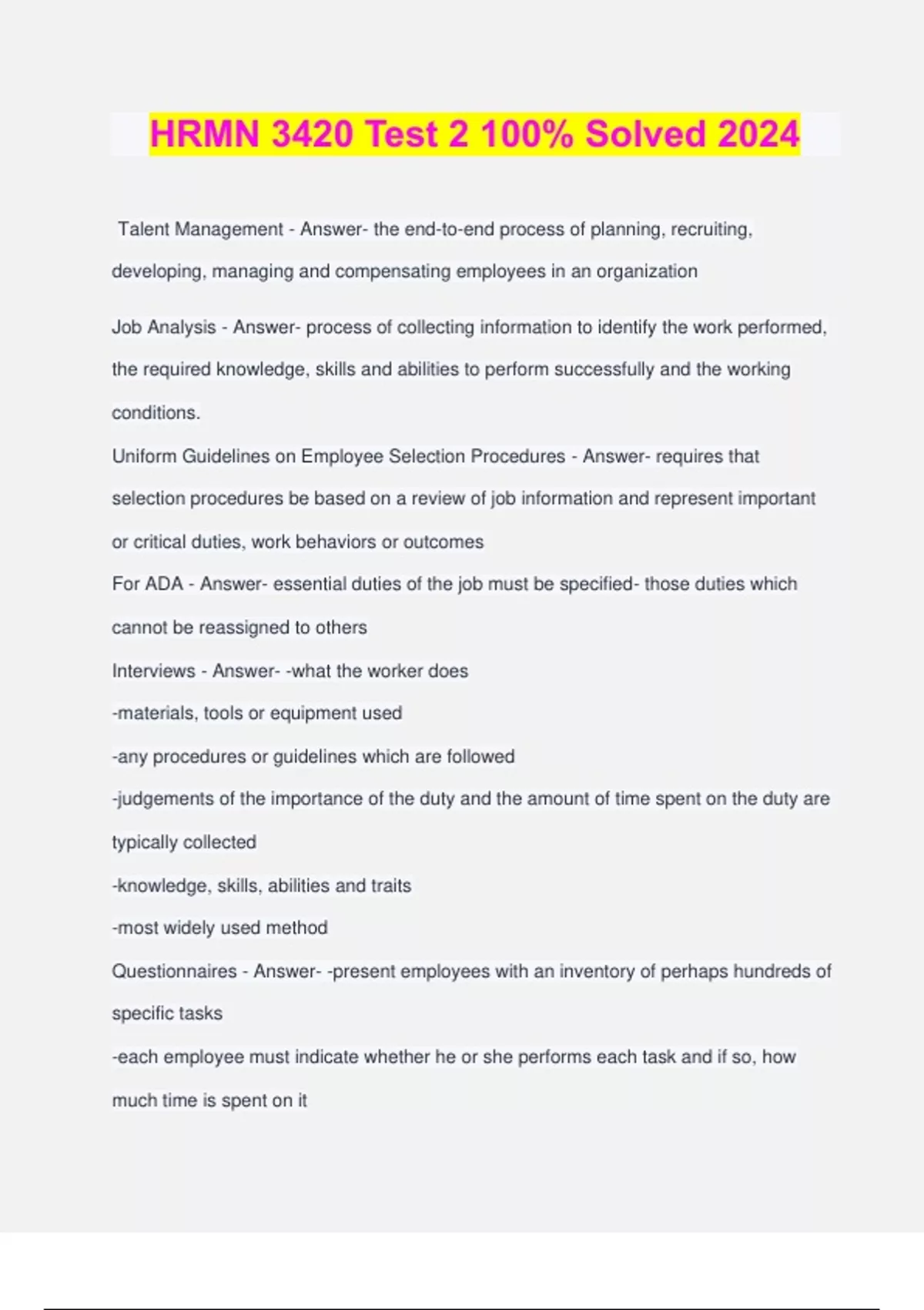 HRMN 3420 Test 2 100% Solved 2024 Talent Management - Answer- the end-to-end process of planning, recruiting, developing, managing and compensating employees in an organization Job Analysis - Answer- process of collecting information to identify the work performed, the required knowledge, skills and abilities to perform successfully and the working conditions. Uniform Guidelines on Employee Selection Procedures - Answer- requires that selection procedures be based on a review of job information and represent important or critical duties, work behaviors or outcomes For ADA - Answer- essential duties of the job must be specified- those duties which cannot be reassigned to others Interviews - Answer- -what the worker does -materials, tools or equipment used -any procedures or guidelines which are followed -judgements of the importance of the duty and the amount of time spent on the duty are typically collected -knowledge, skills, abilities and traits -most widely used method Questionnaires - Answer- -present employees with an inventory of perhaps hundreds of specific tasks -each employee must indicate whether he or she performs each task and if so, how much time is spent on it -relatively low cost and quick way to obtain job info Observation - Answer- -useful for jobs which are mainly physical -anaylst sees the work environment and tools and equipment - doesn't work well with jobs which are primarily cognitive or knowledge-based Diary Logs - Answer- employees log their tasks as they work Job Descriptions - Answer- written statement of what the jobholder does, how he or she does it and under what conditions the job is performed Job Specifications - Answer- written statement of competencies, traits and experience that is required to do the job well. Competency- Based Job Analysis - Answer- a worker's observable and measurable behaviors that make performance possible HR Forecasting - Answer- estimating supply and demand for human resources the organization needs over some future period -personnel needs -supply of inside candidates -supply of outside candidates Forecasting Personnel Needs - Answer- forecast revenues first and then estimate the size of the staff required to achieve this volume -trend analysis -ratio analysis -scatter plots trend analysis - Answer- study your firm's employment levels over the past five years to predict future needs Ratio Analysis - Answer- making forecasts based on the ration between some casual factor and the number of employees required Regression Analysis - Answer- graph the relationship between two variables and use the equation of a line to forecast needs Qualitative Forecasting - Answer- expert opinions and managerial judgement about the industry sector and general economic climate Qualification Inventories - Answer- Manual or computerized records listing employees education, career and development interests, languages, special skills, etc. to identify inside candidates for promotion Recruiting - Answer- the process of developing a pool of qualified candidates Internal Sources of Candidates - Answer- fill positions in the company with current employees. Clear policies should be developed to guide internal recruitment activities to ensure system is perceived as fair by employees Open Recruitment - Answer- advertising the job openly within the organization Targeted Recruiting - Answer- managers privately nominate workers who they feel can do the job Closed Recruiting - Answer- a hiring manager communicates the need to fill a job to HR; HR searches files for people with requisite skills and qualifications and spends the list to the manager Promotability Ratings - Answer- when these ratings are included in the annual appraisal process, it can make internal recruiting more efficient Managerial Sponsorship - Answer- a type of mentoring: managers must provide sponsorship for individual employees before they would be consid
