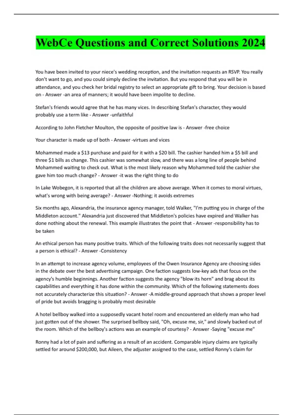 WebCe Questions and Correct Solutions 2024 You have been invited to your niece's wedding reception, and the invitation requests an RSVP. You really don't want to go, and you could simply decline the invitation. But you respond that you will be in attendance, and you check her bridal registry to select an appropriate gift to bring. Your decision is based on - Answer -an area of manners; it would have been impolite to decline. Stefan's friends would agree that he has many vices. In describing Stefan's character, they would probably use a term like - Answer -unfaithful According to John Fletcher Moulton, the opposite of positive law is - Answer -free choice Your character is made up of both - Answer -virtues and vices Mohammed made a $13 purchase and paid for it with a $20 bill. The cashier handed him a $5 bill and three $1 bills as change. This cashier was somewhat slow, and there was a long line of people behind Mohammed waiting to check out. What is the most likely reason why Mohammed told the cashier she gave him too much change? - Answer -it was the right thing to do In Lake Wobegon, it is reported that all the children are above average. When it comes to moral virtues, what's wrong with being average? - Answer -Nothing; it avoids extremes Six months ago, Alexandria, the insurance agency manager, told Walker, "I'm putting you in charge of the Middleton account." Alexandria just discovered that Middleton's policies have expired and Walker has done nothing about the renewal. This example illustrates the point that - Answer -responsibility has to be taken An ethical person has many positive traits. Which of the following traits does not necessarily suggest that a person is ethical? - Answer -Consistency In an attempt to increase agency volume, employees of the Owen Insurance Agency are choosing sides in the debate over the best advertising campaign. One faction suggests low-key ads that focus on the agency's humble beginnings. Another faction suggests the agency "blow its horn" and brag about its capabilities and everything it has done within the community. Which of the following statements does not accurately characterize this situation? - Answer -A middle-ground approach that shows a proper level of pride but avoids bragging is probably most desirable A hotel bellboy walked into a supposedly vacant hotel room and encountered an elderly man who had just gotten out of the shower. The surprised bellboy said, "Oh, excuse me, sir," and slowly backed out of the room. Which of the bellboy's actions was an example of courtesy? - Answer -Saying "excuse me" Ronny had a lot of pain and suffering as a result of an accident. Comparable injury claims are typically settled for around $200,000, but Aileen, the adjuster assigned to the case, settled Ronn