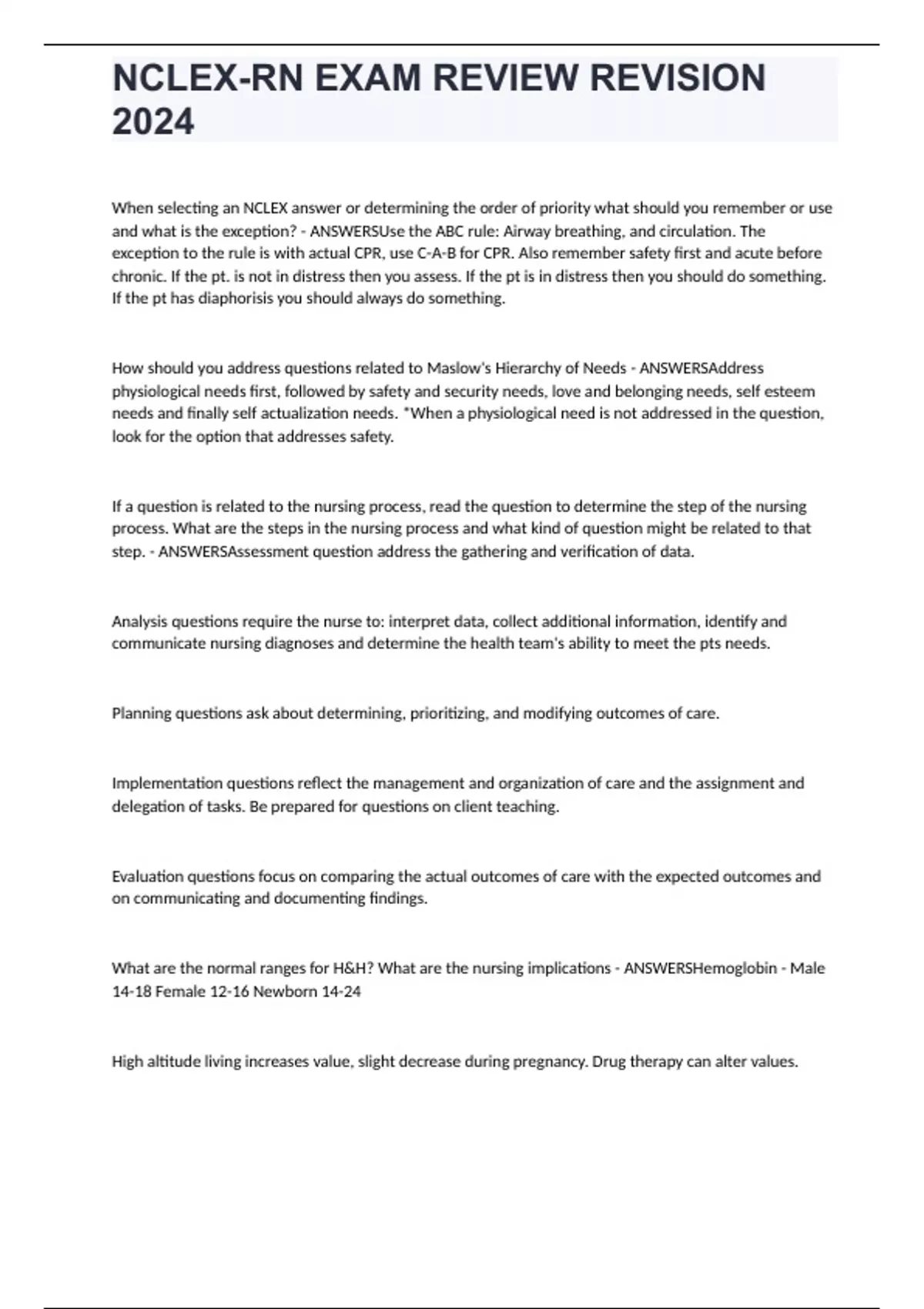 When selecting an NCLEX answer or determining the order of priority what should you remember or use and what is the exception? - ANSWERSUse the ABC rule: Airway breathing, and circulation. The exception to the rule is with actual CPR, use C-A-B for CPR. Also remember safety first and acute before chronic. If the pt. is not in distress then you assess. If the pt is in distress then you should do something. If the pt has diaphorisis you should always do something. How should you address questions related to Maslow's Hierarchy of Needs - ANSWERSAddress physiological needs first, followed by safety and security needs, love and belonging needs, self esteem needs and finally self actualization needs. *When a physiological need is not addressed in the question, look for the option that addresses safety. If a question is related to the nursing process, read the question to determine the step of the nursing process. What are the steps in the nursing process and what kind of question might be related to that step. - ANSWERSAssessment question address the gathering and verification of data. Analysis questions require the nurse to: interpret data, collect additional information, identify and communicate nursing diagnoses and determine the health team's ability to meet the pts needs. Planning questions ask about determining, prioritizing, and modifying outcomes of care. Implementation questions reflect the management and organization of care and the assignment and delegation of tasks. Be prepared for questions on client teaching. Evaluation questions focus on comparing the actual outcomes of care with the expected outcomes and on communicating and documenting findings. What are the normal ranges for H&H? What are the nursing implications - ANSWERSHemoglobin - Male 14-18 Female 12-16 Newborn 14-24 High altitude living increases value, slight decrease during pregnancy. Drug therapy can alter values. Hematocrit - Male 42-52 Female 37-47 Newborn 44-64 Prolonged stasis from vasoconstriction secondary to the tourniquet can alter values. Abnormalities in RBC size may alter Hct values What are the normal ranges for WBC? What can increase values? What can decrease values? How long does the postpartum period of pregnancy affect normal ranges? What range is normal during the postpartum period? - ANSWERSBoth genders Newborn Anesthetics, stress, exercise, and convulsions can increased values. Drug therapy can decrease values. 24-28 hr postpartum: a count as high as 25000 is normal What are the normal ranges for RBC? What can increase levels What happens to levels during pregnancy? - ANSWERSMales: 4.7-6.1 million Female: 4.2-5.4 million Exercise and high altitudes can cause an increase levels pregnancy usually lower values drug therapy can alter values Never draw a specimen from an arm with an infusing IV. What are the normal ranges for PLATELETS? What may increase values? What may decrease values? What drugs decrease values? - ANSWERSBoth Genders: Living at high altitudes, exercising strenuously or taking oral contraceptives may increase values decreased values may be caused by hemorrhage, DIC, reduced production of platelets, infections, use of prosthetic heart valves, and drugs. Drugs that decrease platelets: acetaminophen, aspirin, chemotherapy, H2 blockers, INH, Levaquin, streptomycin, sulfonamides, thiazide diuretics. What are the normal ranges for K+? What should you keep in mind when getting a specimen? - ANSWERS3.5-5 is normal range for potassium Exercise of the forearm with tourniquet in place may cause an increased level. Hemolysis of specimen can result in a falsely elevated value What are the normal ranges for Na+? What should you consider when collecting a specimen? - ANSWERS136-145 is a normal sodium range Do Not collect from an arm with an infusing IV solution What are the normal ranges for Ca+? What type of drug can increase calcium levels? What are two tests with positive results that are associated with hypocalcemia? How do you preform the two tests? - ANSWERS9-10.5 for adults. slightly lower in the elder Use of thiazide diuretics can cause increased levels of calcium Positive Chvostek and Trousseau tests are associated with hypocalcemia. • Chvostek sign: contraction of ipsilateral facial muscles when the facial nerve is tapped just in front of the ear. • Trousseau sign: carpopedal spasm elicited by inflating a sphygmomanometer above systolic BP for 3 minutes. What are the normal ranges for Mg+? What may high magnesium levels indicate? What may low magnesium levels indicate? - ANSWERS1.7-2.2 A high magnesium level may indicate: Addison disease Chronic renal failure, Dehydration, Diabetic acidosis Oliguria A low magnesium level may indicate: Alcoholism Chronic diarrhea, Delirium tremens, Hemodialysis Hepatic (liver) cirrhosis, Hyperaldosteronism Hypoparathyroidism, Pancreatitis, Too much insulin Toxemia of pregnancy, Ulcerative colitis What are the normal ranges for Cl- - ANSWERS98-106 is the normal range for chloride What are the normal ranges for ALP (alkaline phosphatase)? - ANSWERS30-120 slightly increased in the elderly What are the normal ranges for BUN? What does BUN stand for? What is the ratio of BUN-creatinine? What does it indicate? - ANSWERS10-20 blood urea nitrogen BUN-creatinine ratio of 20:1 indicates adequate kidney functioning What are the normal ranges for Creatinine? What is the ratio of BUN-creatinine? What does it indicate? - ANSWERSMale 0.6-1.2 Female 0.5-1.1 BUN-creatinine ratio of 20:1 indicates adequate kidney functioning What is the relationship of Ca+ and PO4? What is the relationship of Ca+ and pH? - ANSWERScalcium and phosphorus have an inverse relationship: when calcium levels increase, phosphorus levels decrease, and vice versa. pH also affects the level of ionized calcium: As pH rises and blood becomes more alkalotic, calcium binds more easily with protein, causing the level of ionized calcium to drop. Conversely, when pH falls, causing acidosis, less calcium b