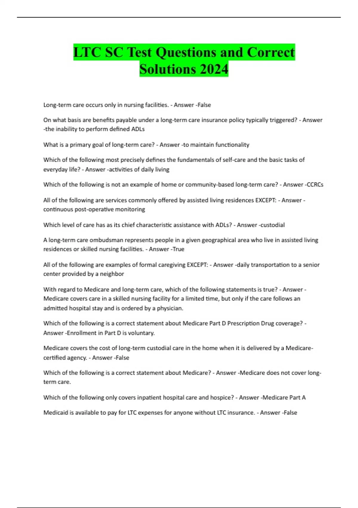 LTC SC Test Questions and Correct Solutions 2024 Long-term care occurs only in nursing facilities. - Answer -False On what basis are benefits payable under a long-term care insurance policy typically triggered? - Answer -the inability to perform defined ADLs What is a primary goal of long-term care? - Answer -to maintain functionality Which of the following most precisely defines the fundamentals of self-care and the basic tasks of everyday life? - Answer -activities of daily living Which of the following is not an example of home or community-based long-term care? - Answer -CCRCs All of the following are services commonly offered by assisted living residences EXCEPT: - Answer - continuous post-operative monitoring Which level of care has as its chief characteristic assistance with ADLs? - Answer -custodial A long-term care ombudsman represents people in a given geographical area who live in assisted living residences or skilled nursing facilities. - Answer -True All of the following are examples of formal caregiving EXCEPT: - Answer -daily transportation to a senior center provided by a neighbor With regard to Medicare and long-term care, which of the following statements is true? - Answer - Medicare covers care in a skilled nursing facility for a limited time, but only if the care follows an admitted hospital stay and is ordered by a physician. Which of the following is a correct statement about Medicare Part D Prescription Drug coverage? - Answer -Enrollment in Part D is voluntary. Medicare covers the cost of long-term custodial care in the home when it is delivered by a Medicarecertified agency. - Answer -False Which of the following is a correct statement about Medicare?