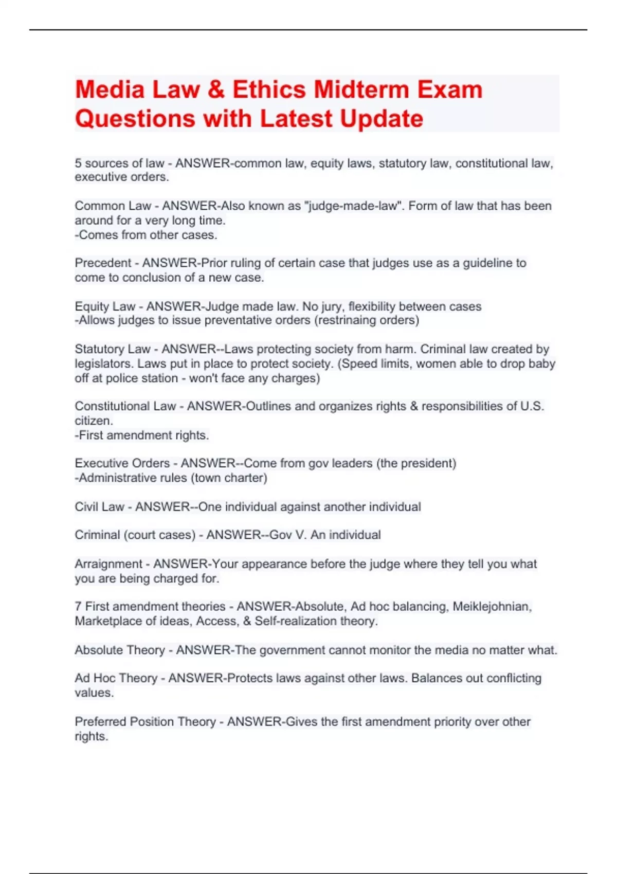 5 sources of law - ANSWER-common law, equity laws, statutory law, constitutional law, executive orders. Common Law - ANSWER-Also known as "judge-made-law". Form of law that has been around for a very long time. -Comes from other cases. Precedent - ANSWER-Prior ruling of certain case that judges use as a guideline to come to conclusion of a new case. Equity Law - ANSWER-Judge made law. No jury, flexibility between cases -Allows judges to issue preventative orders (restrinaing orders) Statutory Law - ANSWER--Laws protecting society from harm. Criminal law created by legislators. Laws put in place to protect society. (Speed limits, women able to drop baby off at police station - won't face any charges) Constitutional Law - ANSWER-Outlines and organizes rights & responsibilities of U.S. citizen. -First amendment rights. Executive Orders - ANSWER--Come from gov leaders (the president) -Administrative rules (town charter) Civil Law - ANSWER--One individual against another individual Criminal (court cases) - ANSWER--Gov V. An individual Arraignment - ANSWER-Your appearance before the judge where they tell you what you are being charged for. 7 First amendment theories - ANSWER-Absolute, Ad hoc balancing, Meiklejohnian, Marketplace of ideas, Access, & Self-realization theory. Absolute Theory - ANSWER-The government cannot monitor the media no matter what. Ad Hoc Theory - ANSWER-Protects laws against other laws. Balances out conflicting values. Preferred Position Theory - ANSWER-Gives the first amendment priority over other rights.