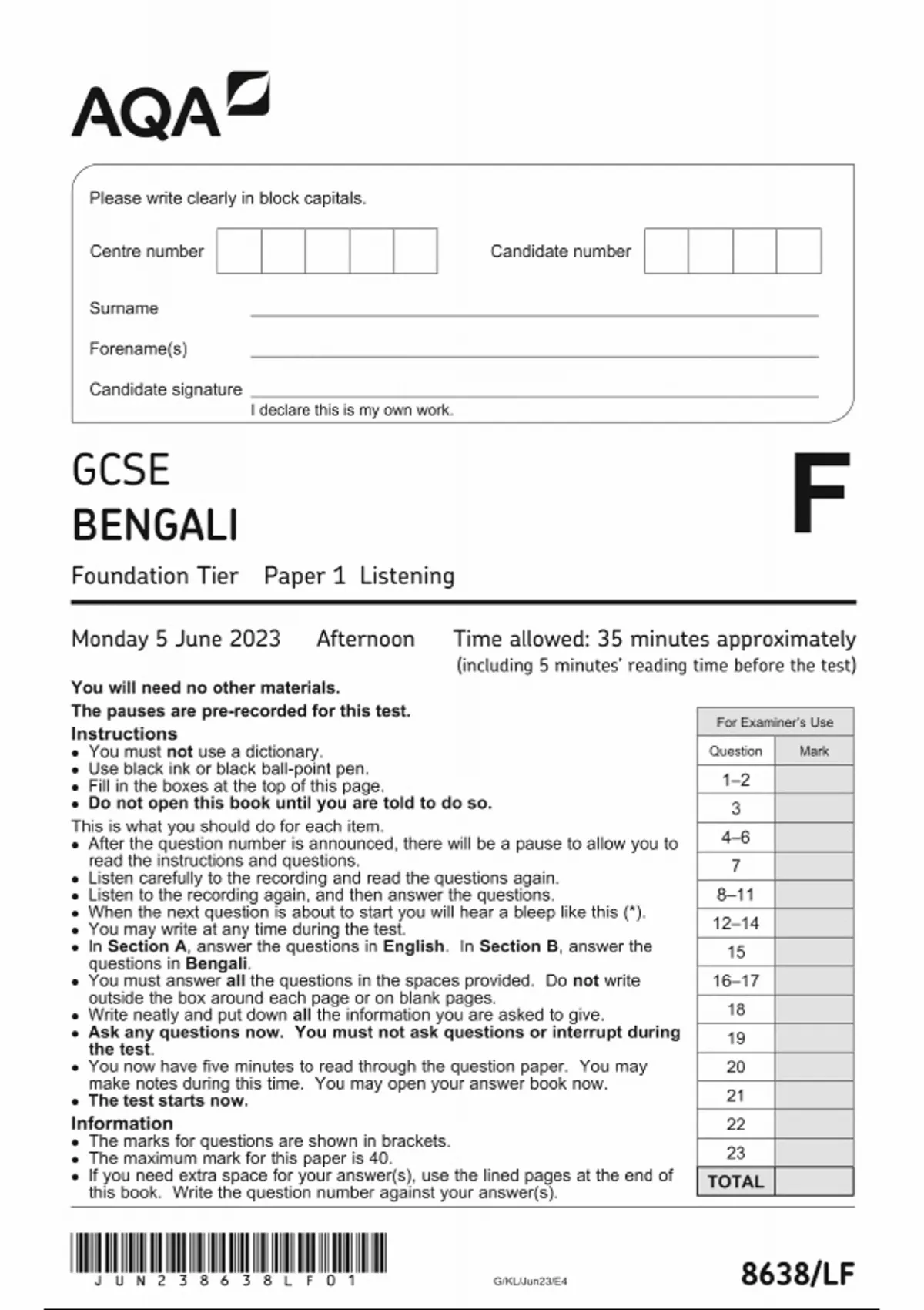 AQA GCSE BENGALI QUESTION PAPER AND MARK SCHEME BUNDLE 2023 [8638/LF: Listening Foundation Tier]