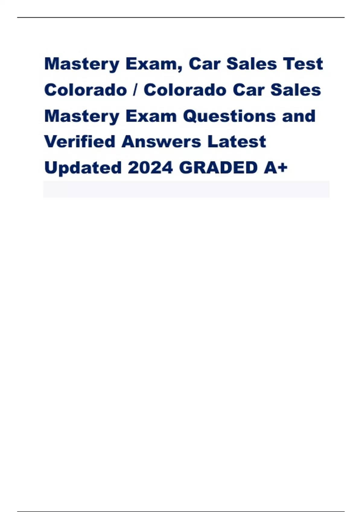 Mastery Exam, Car Sales Test Colorado / Colorado Car Sales Mastery Exam Questions and Verified Answers Latest Updated 2024 GRADED A+