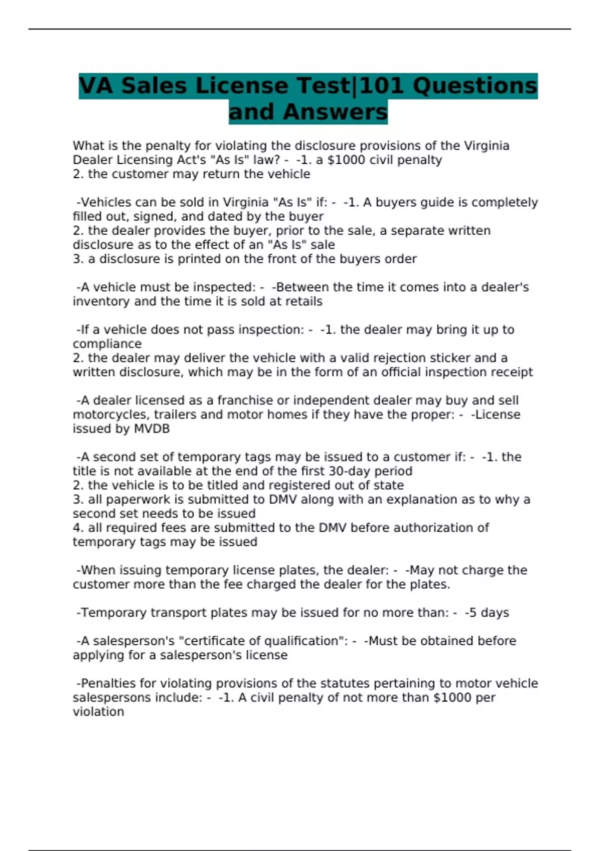 VA Sales License Test|101 Questions and Answers