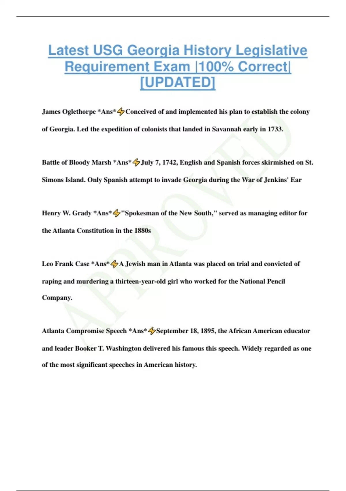 Latest USG Georgia History Legislative Requirement Exam |100% Correct| [UPDATED] James Oglethorpe *Ans* Conceived of and implemented his plan to establish the colony of Georgia. Led the expedition of colonists that landed in Savannah early in 1733. Battle of Bloody Marsh *Ans* July 7, 1742, English and Spanish forces skirmished on St. Simons Island. Only Spanish attempt to invade Georgia during the War of Jenkins' Ear Henry W. Grady *Ans* "Spokesman of the New South," served as managing editor for the Atlanta Constitution in the 1880s Leo Frank Case *Ans* A Jewish man in Atlanta was placed on trial and convicted of raping and murdering a thirteen-year-old girl who worked for the National Pencil Company. Atlanta Compromise Speech *Ans* September 18, 1895, the African American educator and leader Booker T. Washington delivered his famous this speech. Widely regarded as one of the most significant speeches in American history. Hernando de Soto in Georgia *Ans* The first European to explore the interior of what is now the state of Georgia. Entered the state on two occasions during the course of his expedition. Spanish Missions *Ans* Georgia's earliest colonial history is dominated by the lengthy mission era, extending from 1568 through 1684. Catholic missions were the primary means by which Georgia's indigenous Native American chiefdoms were assimilated Yamacraw Indians *Ans* Small band of Native Americans that existed from the late 1720s to the mid-1740s in the Savannah area. First led by Tomochichi Malcontents *Ans* Among those to voice displeasure with the policies of General James Oglethorpe and the Georgia Trustees during the early years of Georgia's settlement. Made their objections heard in 1735 Tomochichi *Ans* Chief of the Yamacraw Indians. Principal mediator between the native population and the new English settlers during the first years of settlement Royal Georgia *Ans* Refers to the period between the termination of Trustee governance of Georgia and the colony's declaration of independence at the beginning of the American Revolution (1775-83)
