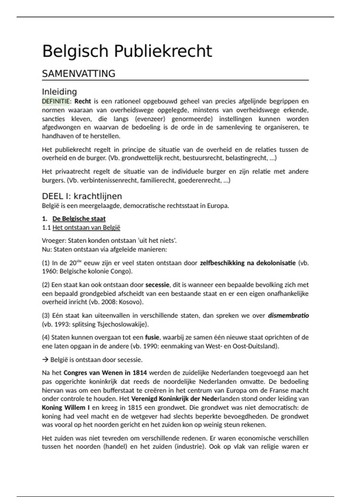 GESLAAGD IN EERSTE ZIT. Dit is een samenvatting voor het vak Belgisch Publiekrecht. Bijna de volledige cursus wordt hierin behandeld. OPGELET niet alles is uitgetypt wegens tijd tekort. MAAR ik slaagde in eerste zit adhv deze samenvatting. Om de delen die ik heb overgeslagen, te leren, raad ik aan de PPT's te leren en eventueel de stukken tekst in de cursus eens te lezen. Ik heb zelf naast deze samenvatting, de PPT's vanbuiten geleerd omdat deze de belangrijkste informatie in kernwoorden weergeven. Veel succes!
