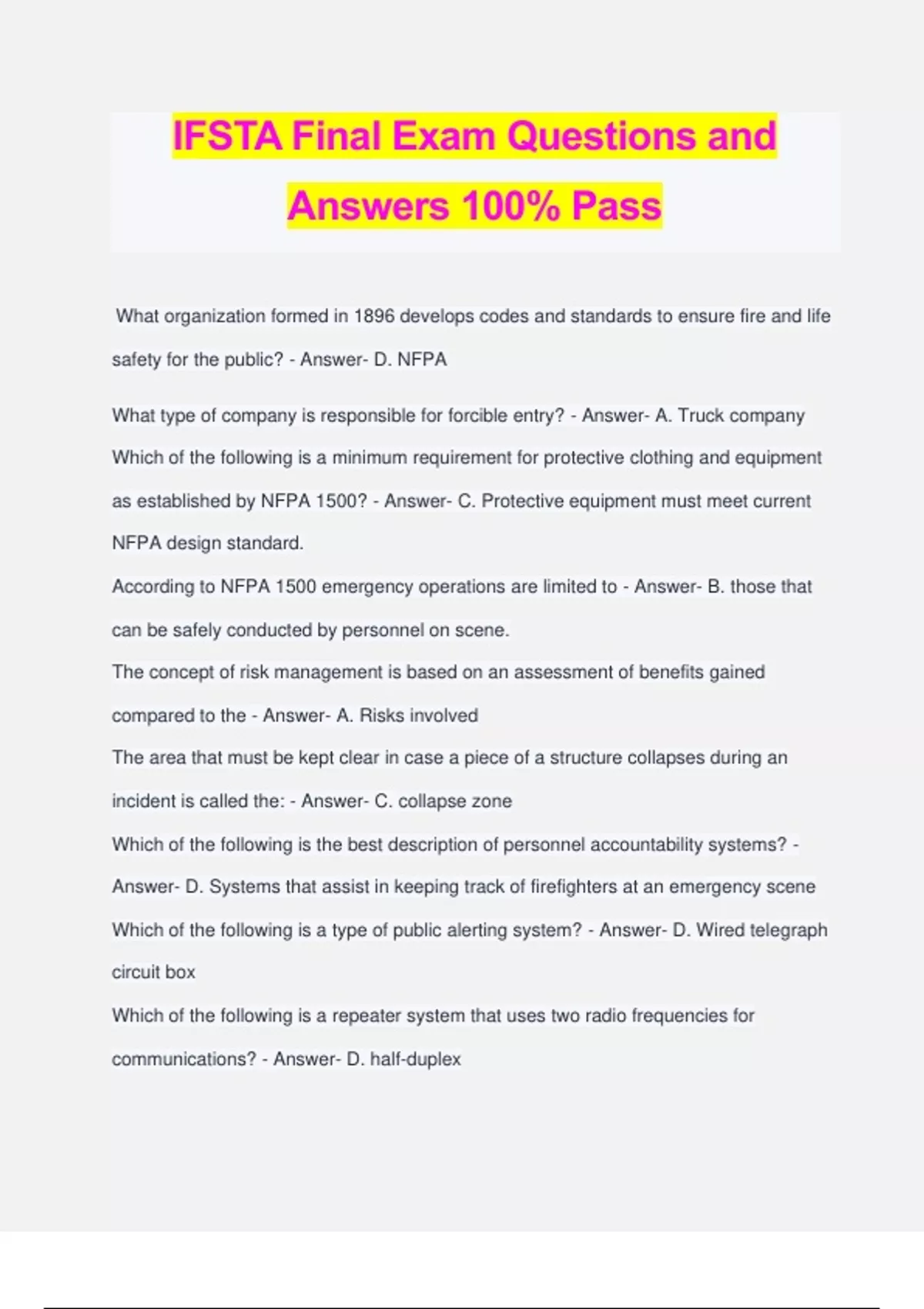 IFSTA Final Exam Questions and Answers 100% Pass What organization formed in 1896 develops codes and standards to ensure fire and life safety for the public? - Answer- D. NFPA What type of company is responsible for forcible entry? - Answer- A. Truck company Which of the following is a minimum requirement for protective clothing and equipment as established by NFPA 1500? - Answer- C. Protective equipment must meet current NFPA design standard. According to NFPA 1500 emergency operations are limited to - Answer- B. those that can be safely conducted by personnel on scene. The concept of risk management is based on an assessment of benefits gained compared to the - Answer- A. Risks involved The area that must be kept clear in case a piece of a structure collapses during an incident is called the: - Answer- C. collapse zone Which of the following is the best description of personnel accountability systems? - Answer- D. Systems that assist in keeping track of firefighters at an emergency scene Which of the following is a type of public alerting system? - Answer- D. Wired telegraph circuit box Which of the following is a repeater system that uses two radio frequencies for communications? - Answer- D. half-duplex Manufactured homes built before 1976 have less _____ than those of current homes. - Answer- B. Fire resistance What part of a roof's construction can be manufactured from smaller pieces of wood or light gauge steel? - Answer- D. Lightweight construction support system What building component may be mounted over doors and windows to prevent illegal entry? - Answer- D. Security bars or grilles Additions to the structure, replacing fire escapes with enclosed stairways, and removing non-load-bearing walls are all types of: - Answer- C. permitted structural modifications. Doors are classified by: - Answer- A. the way they operate. What source of thermal energy is the most common source of heat in combustion reactions? - Answer- C. chemical energy What method of heat transfer occurs when a material is heated as the result of direct contact with a heat source? - Answer- C. conduction Fuel particles become smaller as the ratio of surface-to-mass: - Answer- A. increases Which of the following best describes the impact of higher oxygen concentration on combustion? - Answer- A. Materials burn more intensely What term defines the minimum concentration of fuel vapor and air that supports combustion? - Answer- C. Lower flammable limit Which of the following fire development factors affects heat release rate? - Answer- A. Fuel type Which of the following is defined as the tendency of gases to form into layers according to temperature? - Answer- B. Thermal layering The neutral plane in the growth stage is the: - Answer- D. interface of hot and cool layers at an opening. What fire-suppression method does not work if fuel is self-oxidizing? - Answer- B. Oxygen exclusion What is the minimum overlap between coat and trousers when the wearer is bent over to a 90 degree angle? - Answer- A. 2 inches (50 mm) What two respiratory hazards are responsible for the majority of fire-related fatalities? - Answer- C. Carbon monoxide and hydrogen cyanide What classification of portable fire extinguishers is used for fires that involve combustible liquids and gases? - Answer- B. Class B On a multiple marking extinguisher the ratings for each class are - Answer- C. separate, they do not affect each other. Signal to others that a portable fire extinguisher is empty by: - Answer- A. laying it on its side. Which of the following type of rope is constructed of a braided core enclosed in a braided, herringbone-pattern sheath? - Answer- B. Braid on braid