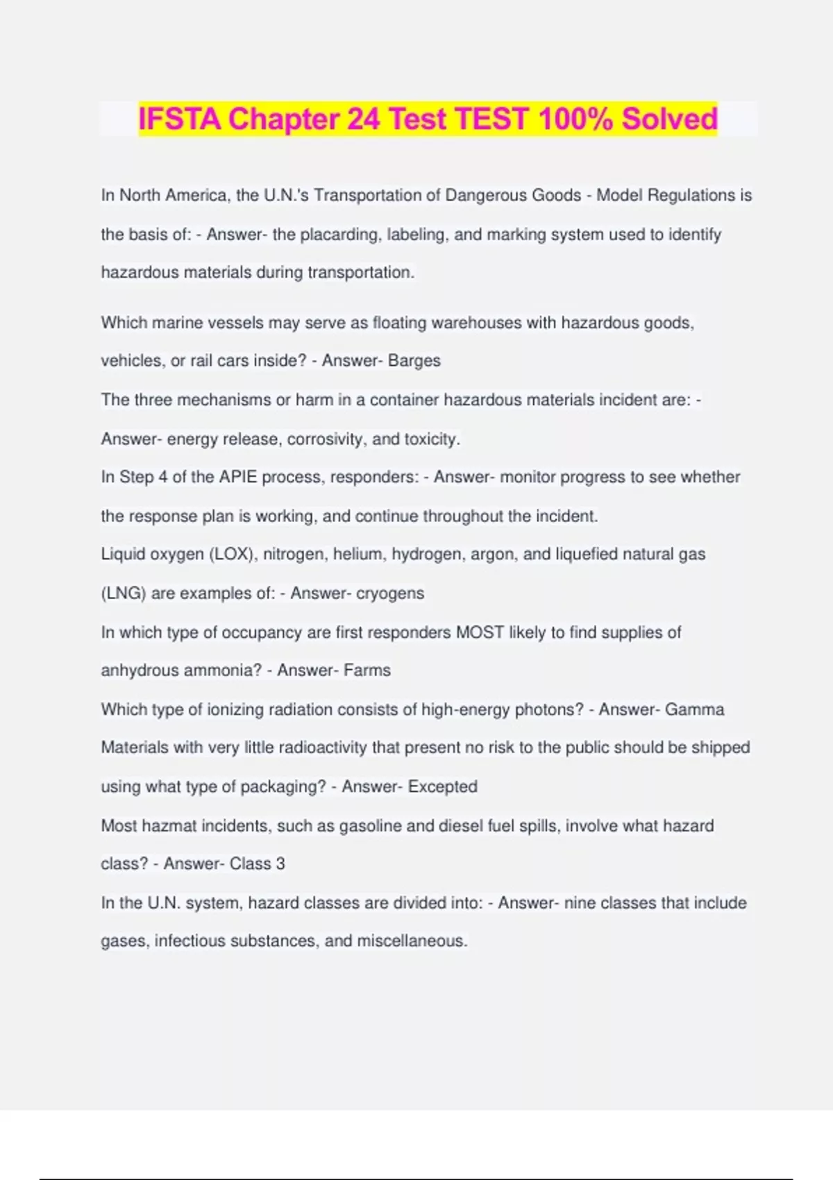 IFSTA Chapter 24 Test TEST 100% Solved In North America, the U.N.'s Transportation of Dangerous Goods - Model Regulations is the basis of: - Answer- the placarding, labeling, and marking system used to identify hazardous materials during transportation. Which marine vessels may serve as floating warehouses with hazardous goods, vehicles, or rail cars inside? - Answer- Barges The three mechanisms or harm in a container hazardous materials incident are: - Answer- energy release, corrosivity, and toxicity. In Step 4 of the APIE process, responders: - Answer- monitor progress to see whether the response plan is working, and continue throughout the incident. Liquid oxygen (LOX), nitrogen, helium, hydrogen, argon, and liquefied natural gas (LNG) are examples of: - Answer- cryogens In which type of occupancy are first responders MOST likely to find supplies of anhydrous ammonia? - Answer- Farms Which type of ionizing radiation consists of high-energy photons? - Answer- Gamma Materials with very little radioactivity that present no risk to the public should be shipped using what type of packaging? - Answer- Excepted Most hazmat incidents, such as gasoline and diesel fuel spills, involve what hazard class? - Answer- Class 3 In the U.N. system, hazard classes are divided into: - Answer- nine classes that include gases, infectious substances, and miscellaneous. A boiling liquid expanding vapor explosion (BLEVE) is caused by: - Answer- a heated liquid or gas expanding. In addition to burning, all flammable and combustible liquids exhibit varying degrees of: - Answer- toxicity. Which method of detecting the presence of hazardous materials would pose the least risk for a first responder? - Answer- Referring to a preincident survey of the facility Locations such as ports, docks, railroad sidings, airplane hangars, and truck terminals: - Answer- are likely locations for hazmat incidents. The damaging effects of ionizing radiation occur at the _____ level. - Answer- cellular Small airborne particles of solid substances such as grain, flour, sugar, coal, metal, or sawdust: - Answer- can ignite or explode. Which statement about gases is most accurate? - Answer- Gases have an undefined shape and keep expanding if uncontained. What is a descriptive name, identification number, weight, or specification that includes instructions, cautions, or U.N. marks, and is required on outer packaging of hazardous materials? - Answer- Marking A fuel that has moved beyond its upper flammable limit will: - Answer- be too rich to burn. Which statement about pipelines is MOST accurate? - Answer- Pipeline companies must provide markers where pipelines cross under (or over) railroads or waterways. What are some reasons that preincident surveys might not be accurate or useful in a hazmat incident? - Answer- Inventories, businesses, or other factors may change without notice. Breathing hazardous materials in through the nose or mouth is defined as: - Answer- inhalation Acute health effects are: - Answer- short-term effects that appear within hours or days. What is a 3.9-inch (100 mm) square-on-point diamond that identifies hazardous materials within packaging? - Answer- Label Biohazards such as infectious substances are part of which hazardous class? - Answer- Class 6 The concentration (in air) at which the "average person" can smell a particular compound is the: - Answer- odor threshold. Uniform classification of hazardous substances and uniform labeling standards are key elements of: - Answer- the Globally Harmonized System (GHS). Safety data sheets: - Answer- are often the best source of information about a particular material to which emergency responders have access. Once hazardous materials are detected, first responders should: - Answer- use a number of resources to identify the materials and potential hazards. Chemical Inventory Lists (CILs) at facilities usually contain information about locations of materials within a facility, making them useful tools for: - Answer- identifying containers that have been damaged or are missing labels or markings. Flammable gases have: - Answer- very low flash points. Which type of container breach has been documented as c
