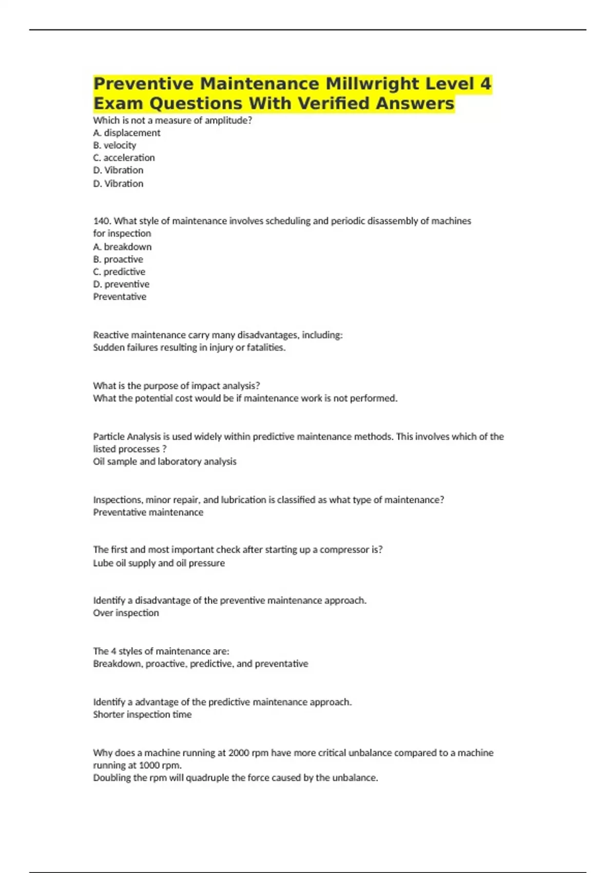 Preventive Maintenance Millwright Level 4 Exam Questions With Verified Answers Which is not a measure of amplitude? A. displacement B. velocity C. acceleration D. Vibration D. Vibration 140. What style of maintenance involves scheduling and periodic disassembly of machines for inspection A. breakdown B. proactive C. predictive D. preventive Preventative Reactive maintenance carry many disadvantages, including: Sudden failures resulting in injury or fatalities. What is the purpose of impact analysis? What the potential cost would be if maintenance work is not performed. Particle Analysis is used widely within predictive maintenance methods. This involves which of the listed processes ? Oil sample and laboratory analysis Inspections, minor repair, and lubrication is classified as what type of maintenance? Preventative maintenance The first and most important check after starting up a compressor is? Lube oil supply and oil pressure Identify a disadvantage of the preventive maintenance approach. Over inspection The 4 styles of maintenance are: Breakdown, proactive, predictive, and preventative Identify a advantage of the predictive maintenance approach. Shorter inspection time Why does a machine running at 2000 rpm have more critical unbalance compared to a machine running at 1000 rpm. Doubling the rpm will quadruple the force caused by the unbalance.