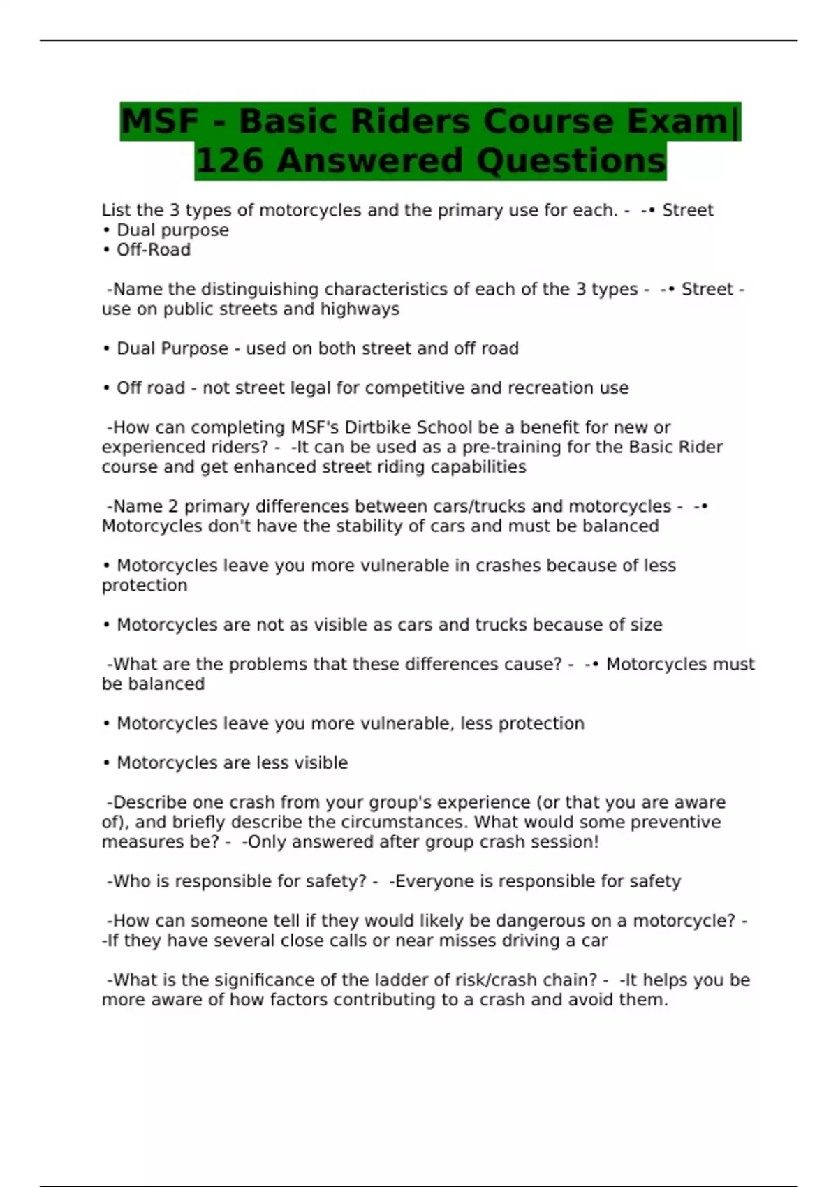 MSF - Basic Riders Course Exam|126 Answered Questions