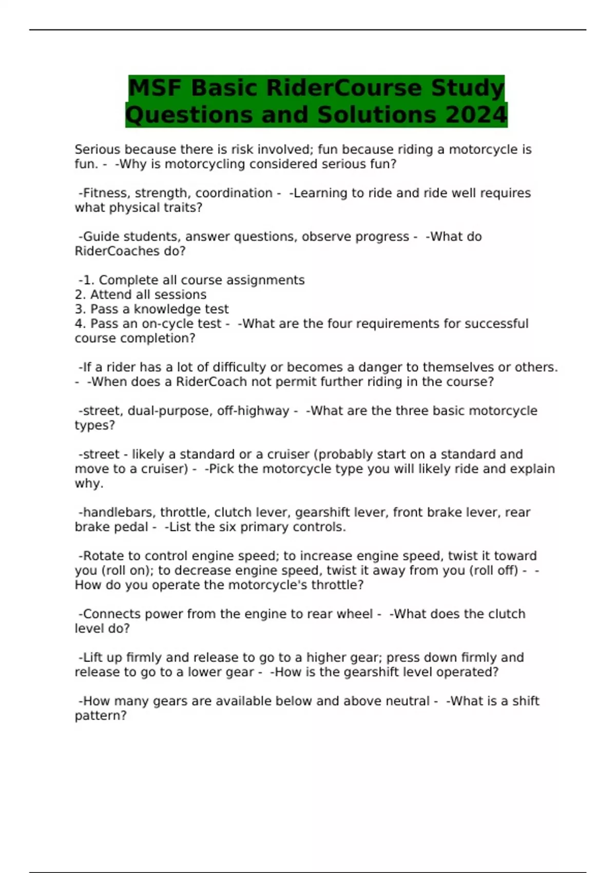 MSF Basic RiderCourse Study Questions and Solutions 2024