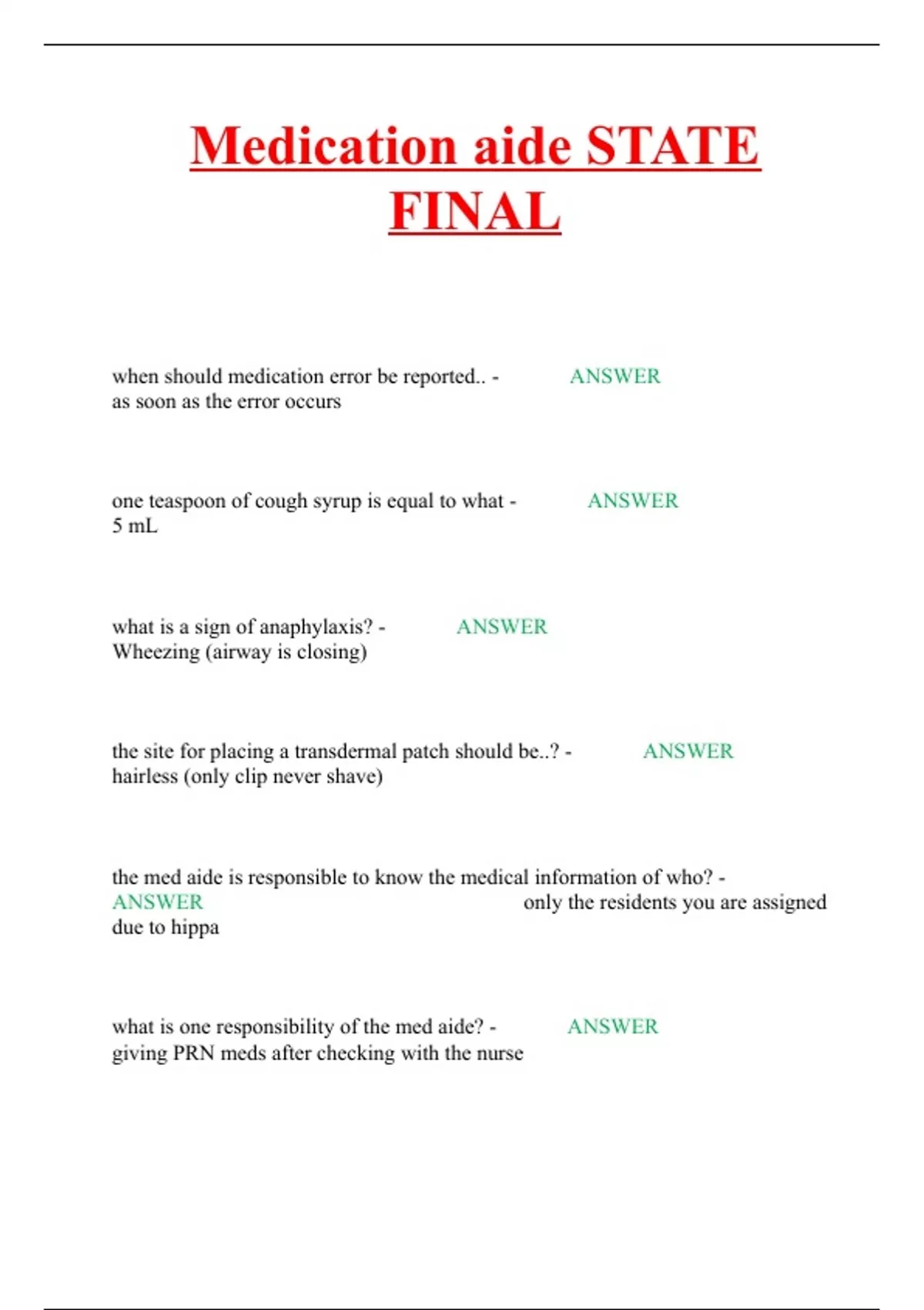 Medication aide STATE FINAL when should medication error be reported.. - ANSWER as soon as the error occurs one teaspoon of cough syrup is equal to what - ANSWER 5 mL what is a sign of anaphylaxis? - ANSWER Wheezing (airway is closing) the site for placing a transdermal patch should be..? - ANSWER hairless (only clip never shave) the med aide is responsible to know the medical information of who? - ANSWER only the residents you are assigned due to hippa what is one responsibility of the med aide? - ANSWER giving PRN meds after checking with the nurse