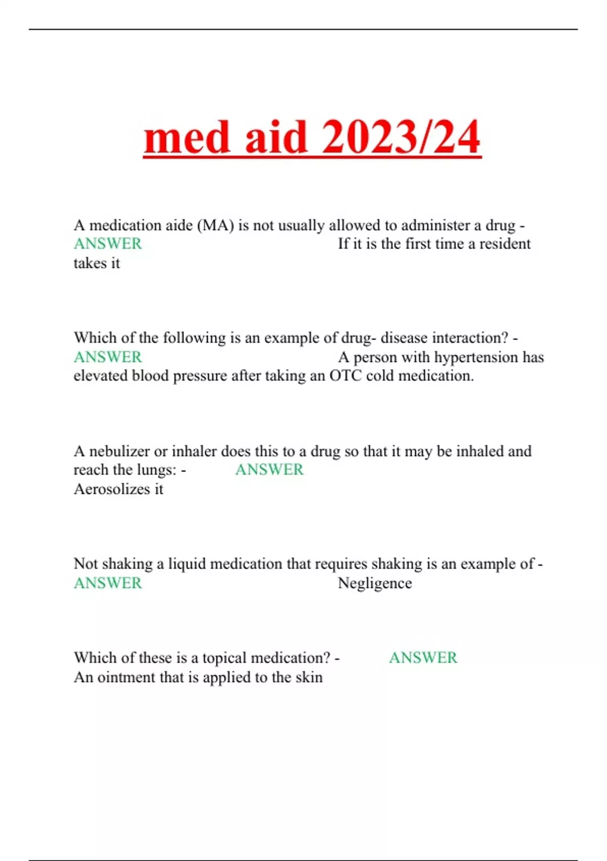 med aid 2023/24 A medication aide (MA) is not usually allowed to administer a drug - ANSWER If it is the first time a resident takes it Which of the following is an example of drug- disease interaction? - ANSWER A person with hypertension has elevated blood pressure after taking an OTC cold medication. A nebulizer or inhaler does this to a drug so that it may be inhaled and reach the lungs: - ANSWER Aerosolizes it Not shaking a liquid medication that requires shaking is an example of - ANSWER Negligence Which of these is a topical medication? - ANSWER An ointment that is applied to the skin