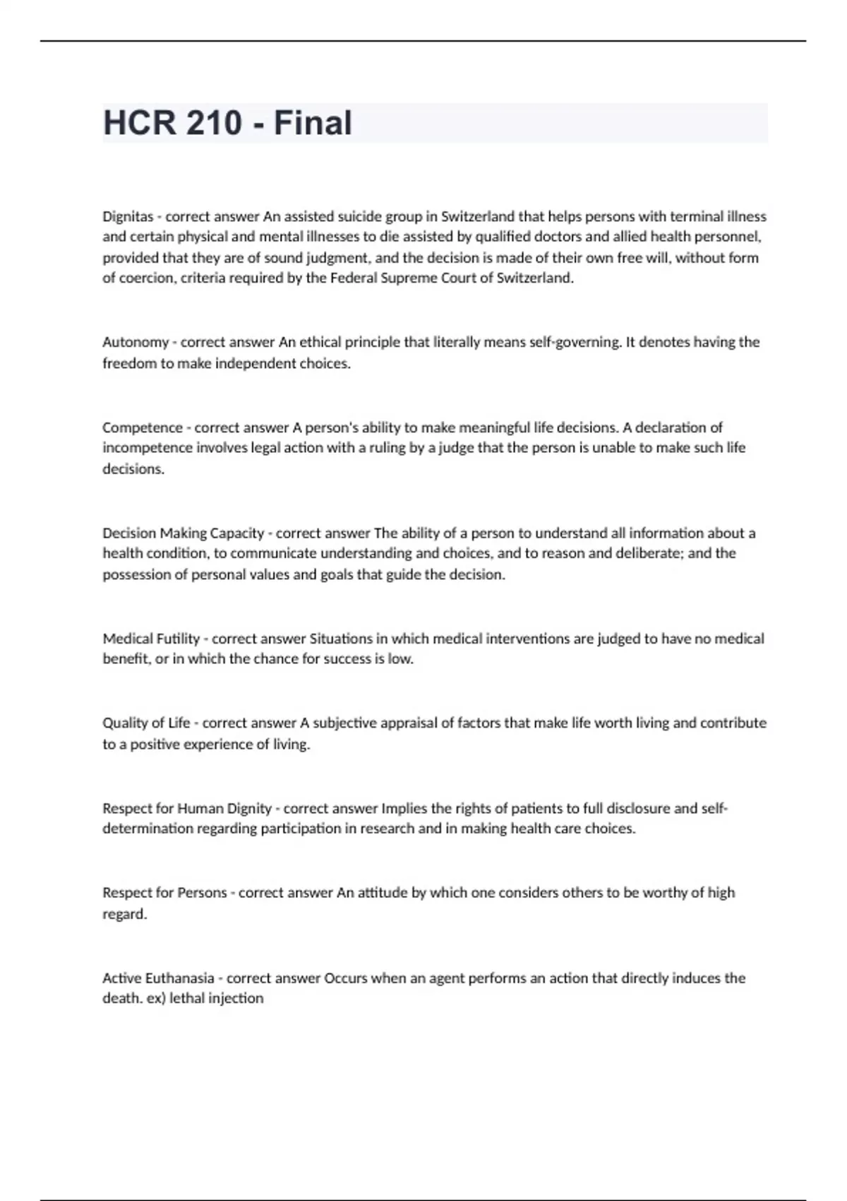 HCR210 Arizona State University -HCR 210 - Final correctly answeredDignitas - correct answer An assisted suicide group in Switzerland that helps persons with terminal illness and certain physical and mental illnesses to die assisted by qualified doctors and allied health personnel, provided that they are of sound judgment, and the decision is made of their own free will, without form of coercion, criteria required by the Federal Supreme Court of Switzerland. Autonomy - correct answer An ethical principle that literally means self-governing. It denotes having the freedom to make independent choices. Competence - correct answer A person's ability to make meaningful life decisions. A declaration of incompetence involves legal action with a ruling by a judge that the person is unable to make such life decisions. Decision Making Capacity - correct answer The ability of a person to understand all information about a health condition, to communicate understanding and choices, and to reason and deliberate; and the possession of personal values and goals that guide the decision. Medical Futility - correct answer Situations in which medical interventions are judged to have no medical benefit, or in which the chance for success is low. Quality of Life - correct answer A subjective appraisal of factors that make life worth living and contribute to a positive experience of living. Respect for Human Dignity - correct answer Implies the rights of patients to full disclosure and self-determination regarding participation in research and in making health care choices. Respect for Persons - correct answer An attitude by which one considers others to be worthy of high regard. Active Euthanasia - correct answer Occurs when an agent performs an action that directly induces the death. ex) lethal injection