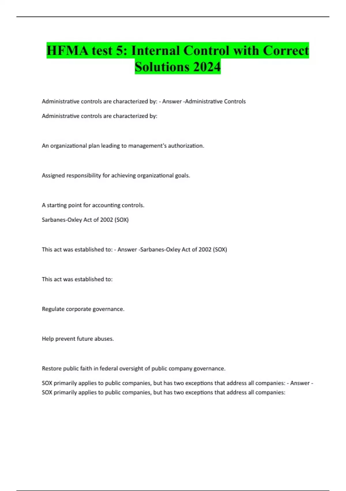HFMA test 5: Internal Control with Correct Solutions 2024 Administrative controls are characterized by: - Answer -Administrative Controls Administrative controls are characterized by: An organizational plan leading to management's authorization. Assigned responsibility for achieving organizational goals. A starting point for accounting controls. Sarbanes-Oxley Act of 2002 (SOX) This act was established to: - Answer -Sarbanes-Oxley Act of 2002 (SOX) This act was established to: Regulate corporate governance. Help prevent future abuses. Restore public faith in federal oversight of public company governance. SOX primarily applies to public companies, but has two exceptions that address all companies: - Answer - SOX primarily applies to public companies, but has two exceptions that address all companies:Whistleblower----SOX offers protections for those who report suspected illegal corporate activities (otherwise known as whistleblowers).Intentional retaliation against a whistleblower could result in fines and up to 10 years of imprisonment. Document Destruction---SOX Section 802 amended federal laws to provide for fines and possible imprisonment of up to 20 years if an individual:Knowingly alters, destroys, mutilates, conceals, covers up, falsifies, or makes a false entry in any record or document with intention to impede, obstruct, or influence a federal governmental agency or department investigation SOX and Not-for-Profit - Answer -SOX and Not-for-Profits SOX is not mandatory for not-for-profits, with the exception of the Whistleblower and Document Destruction provisions. However, external lenders and the public will expect not-for-profit entities to demonstrate effective governance, internal controls, and provide transparency of its operations. It is in best interest for not-for-profit entities to consider complying with many SOX provisions. SOX & NP Hospital - Answer -Not-for-Profit Hospitals Not-for-profit hospitals are well advised to examine their own best practices to ensure that they can do the following: 1) Justify their tax-exempt status more clearly. 2) Review executive compensation. 3) Assess membership on boards and committees. 4) Increase awareness of finances and financial controls. 5) Evaluate compliance with certification requirements