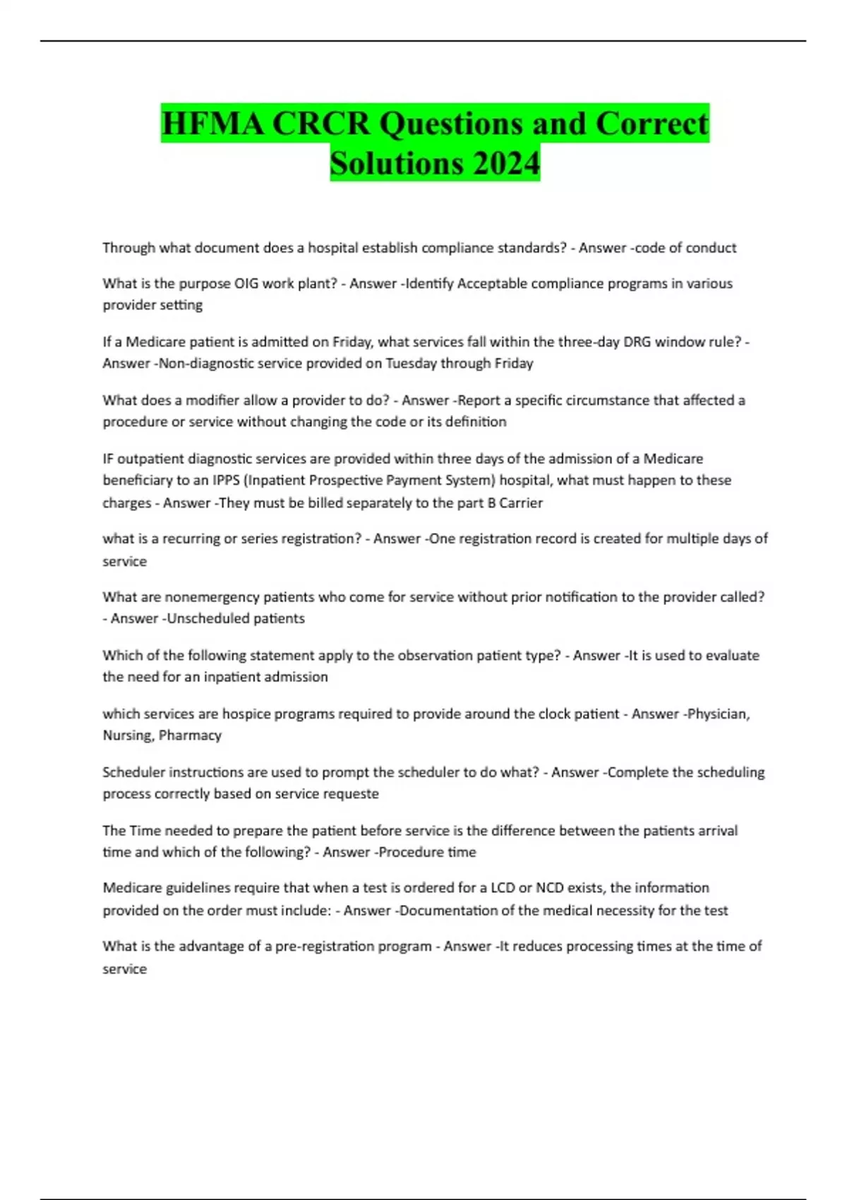 HFMA CRCR Questions and Correct Solutions 2024 Through what document does a hospital establish compliance standards? - Answer -code of conduct What is the purpose OIG work plant? - Answer -Identify Acceptable compliance programs in various provider setting If a Medicare patient is admitted on Friday, what services fall within the three-day DRG window rule? - Answer -Non-diagnostic service provided on Tuesday through Friday What does a modifier allow a provider to do? - Answer -Report a specific circumstance that affected a procedure or service without changing the code or its definition IF outpatient diagnostic services are provided within three days of the admission of a Medicare beneficiary to an IPPS (Inpatient Prospective Payment System) hospital, what must happen to these charges - Answer -They must be billed separately to the part B Carrier what is a recurring or series registration? - Answer -One registration record is created for multiple days of service What are nonemergency patients who come for service without prior notification to the provider called? - Answer -Unscheduled patients Which of the following statement apply to the observation patient type? - Answer -It is used to evaluate the need for an inpatient admission which services are hospice programs required to provide around the clock patient - Answer -Physician, Nursing, Pharmacy Scheduler instructions are used to prompt the scheduler to do what? - Answer -Complete the scheduling process correctly based on service requeste The Time needed to prepare the patient before service is the difference between the patients arrival time and which of the following? - Answer -Procedure time Medicare guidelines require that when a test is ordered for a LCD or NCD exists, the information provided on the order must include: - Answer -Documentation of the medical necessity for the test What is the advantage of a pre-registration program - Answer -It reduces processing times at the time of serviceWhat date are required to establish a new MPI(Master patient Index) entry - Answer -The responsible party's full legal name, date of birth, and social security number Which of the following statements is true about third-party payments? - Answer -The payments are received by the provider from the payer responsible for reimbursing the provider for the patient's covered services. Which provision protects the patient from medical expenses that exceed the pre-set level - Answer -stop loss what documentation must a primary care physician send to HMO patient to authorize a visit to a specialist for additional testing or care? - Answer -Referral Under EMTALA (Emergency Medical Treatment and Labor Act) regulations, the provider may not ask about a patient's insurance information if it would delay what? - Answer -Medical screening and stabilizing treatment