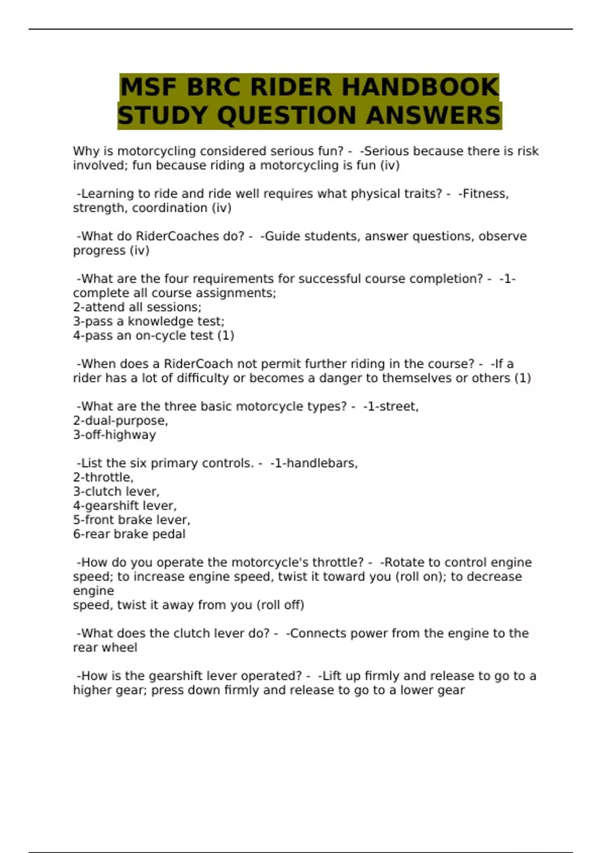 MSF BRC RIDER HANDBOOK STUDY QUESTION ANSWERS