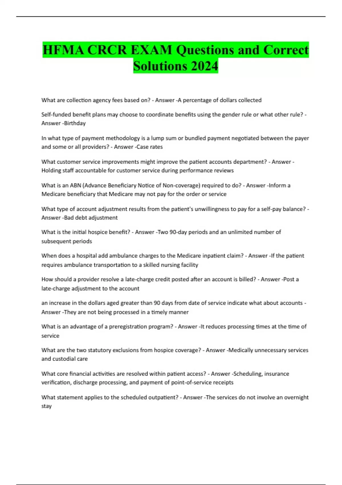 HFMA CRCR EXAM Questions and Correct Solutions 2024 What are collection agency fees based on? - Answer -A percentage of dollars collected Self-funded benefit plans may choose to coordinate benefits using the gender rule or what other rule? - Answer -Birthday In what type of payment methodology is a lump sum or bundled payment negotiated between the payer and some or all providers? - Answer -Case rates What customer service improvements might improve the patient accounts department? - Answer - Holding staff accountable for customer service during performance reviews What is an ABN (Advance Beneficiary Notice of Non-coverage) required to do? - Answer -Inform a Medicare beneficiary that Medicare may not pay for the order or service What type of account adjustment results from the patient's unwillingness to pay for a self-pay balance? - Answer -Bad debt adjustment What is the initial hospice benefit? - Answer -Two 90-day periods and an unlimited number of subsequent periods When does a hospital add ambulance charges to the Medicare inpatient claim? - Answer -If the patient requires ambulance transportation to a skilled nursing facility How should a provider resolve a late-charge credit posted after an account is billed? - Answer -Post a late-charge adjustment to the account an increase in the dollars aged greater than 90 days from date of service indicate what about accounts - Answer -They are not being processed in a timely manner What is an advantage of a preregistration program? - Answer -It reduces processing times at the time of service What are the two statutory exclusions from hospice coverage? - Answer -Medically unnecessary services and custodial care What core financial activities are resolved within patient access? - Answer -Scheduling, insurance verification, discharge processing, and payment of point-of-service receipts What statement applies to the scheduled outpatient? - Answer -The services do not involve an overnight stayHow is a mis-posted contractual allowance resolved? - Answer -Comparing the contract reimbursement rates with the contract on the admittance advice to identify the correct amount What type of patient status is used to evaluate the patient's need for inpatient care? - Answer - Observation Coverage rules for Medicare beneficiaries receiving skilled nursing care require that the beneficiary has received what? - Answer -Medically necessary inpatient hospital services for at least 3 consecutive days before the skilled nursing care admission When is the word "SAME" entered on the CMS 1500 billing form in Field 0$? - Answer -When the patient is the insured What are non-emergency patients who come for service without prior notification to the provider called? - Answer -Unscheduled patients If the insurance verification response reports that a subscriber has a single policy, what is the status of the subscriber's spouse? - Answer -Neither enrolled not entitled to benefits