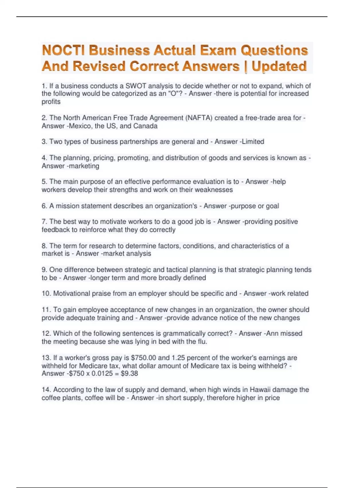 NOCTI Business Actual Exam Questions And Revised Correct Answers | Updated 1. If a business conducts a SWOT analysis to decide whether or not to expand, which of the following would be categorized as an "O"? - Answer -there is potential for increased profits 2. The North American Free Trade Agreement (NAFTA) created a free-trade area for - Answer -Mexico, the US, and Canada 3. Two types of business partnerships are general and - Answer -Limited 4. The planning, pricing, promoting, and distribution of goods and services is known as - Answer -marketing 5. The main purpose of an effective performance evaluation is to - Answer -help workers develop their strengths and work on their weaknesses 6. A mission statement describes an organization's - Answer -purpose or goal 7. The best way to motivate workers to do a good job is - Answer -providing positive feedback to reinforce what they do correctly 8. The term for research to determine factors, conditions, and characteristics of a market is - Answer -market analysis 9. One difference between strategic and tactical planning is that strategic planning tends to be - Answer -longer term and more broadly defined 10. Motivational praise from an employer should be specific and - Answer -work related 11. To gain employee acceptance of new changes in an organization, the owner should provide adequate training and - Answer -provide advance notice of the new changes 12. Which of the following sentences is grammatically correct? - Answer -Ann missed the meeting because she was lying in bed with the flu. 13. If a worker's gross pay is $750.00 and 1.25 percent of the worker's earnings are withheld for Medicare tax, what dollar amount of Medicare tax is being withheld? - Answer -$750 x 0.0125 = $9.38
