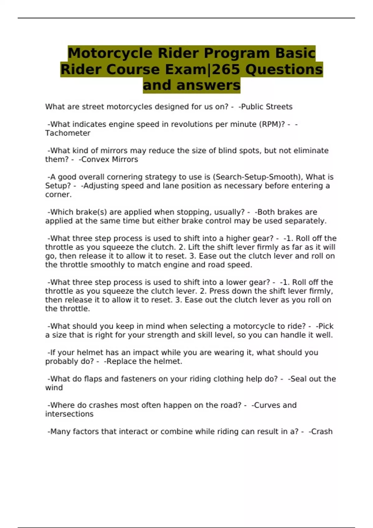 Motorcycle Rider Program Basic Rider Course Exam|265 Questions and answers