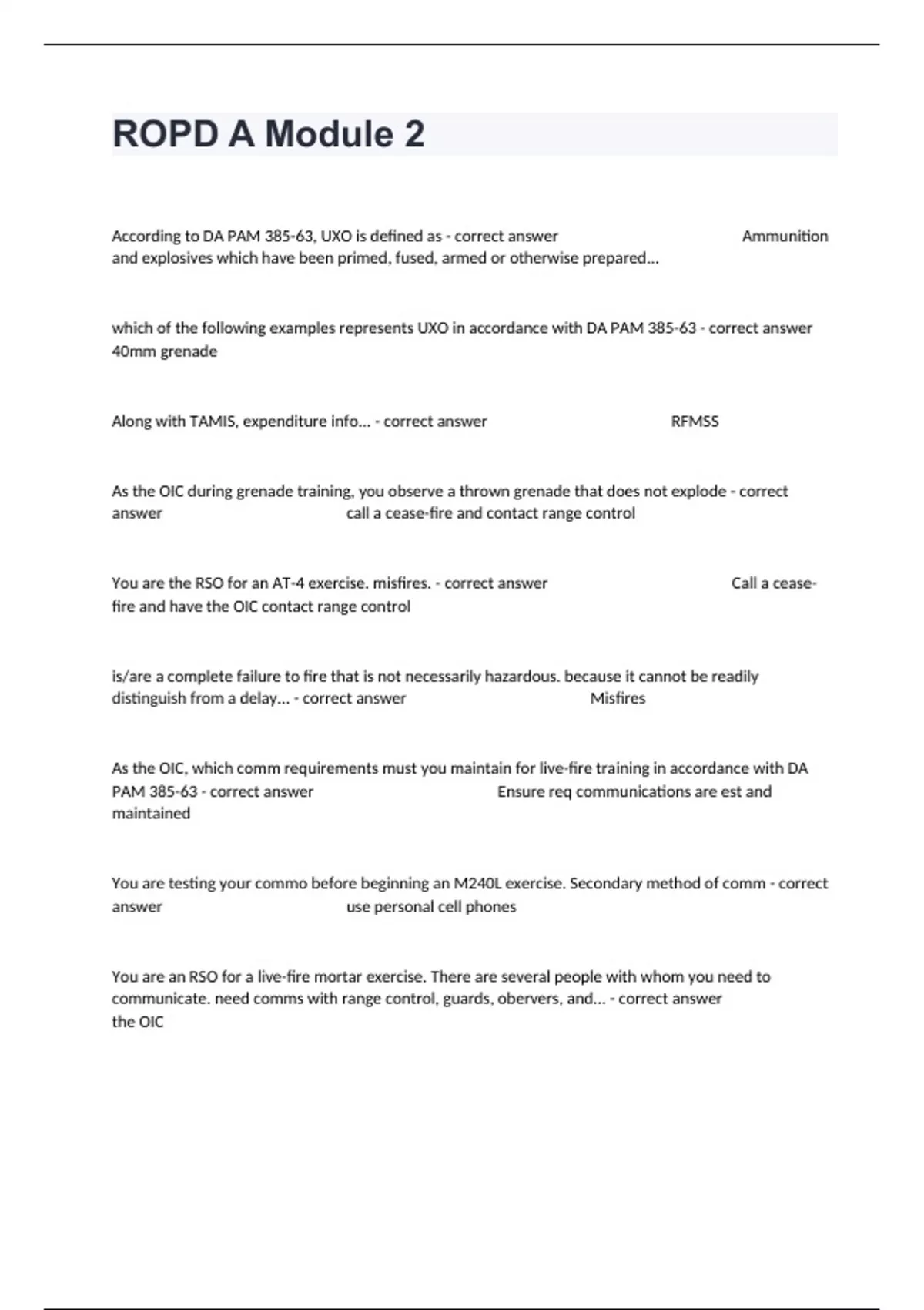 According to DA PAM 385-63, UXO is defined as - correct answer Ammunition and explosives which have been primed, fused, armed or otherwise prepared... which of the following examples represents UXO in accordance with DA PAM 385-63 - correct answer 40mm grenade Along with TAMIS, expenditure info... - correct answer RFMSS As the OIC during grenade training, you observe a thrown grenade that does not explode - correct answer call a cease-fire and contact range control You are the RSO for an AT-4 exercise. misfires. - correct answer Call a cease-fire and have the OIC contact range control is/are a complete failure to fire that is not necessarily hazardous. because it cannot be readily distinguish from a delay... - correct answer Misfires As the OIC, which comm requirements must you maintain for live-fire training in accordance with DA PAM 385-63 - correct answer Ensure req communications are est and maintained You are testing your commo before beginning an M240L exercise. Secondary method of comm - correct answer use personal cell phones You are an RSO for a live-fire mortar exercise. There are several people with whom you need to communicate. need comms with range control, guards, obervers, and... - correct answer the OIC soldiers is hit in the arm by a ricochet fragement - correct answer Call cease-fire and start first aid as needed PVT Sanchez yells to tell you that LT Jones has been hit by a ricochet fragment IN THE FACE!! - correct answer Move everyone away from the injury scene responsibility of both the OIC and RSO to - correct answer all of the above IAW DA PAM 385-63, statement that best represents the requirement when training with live and blank or dummy ammo - correct answer live and blank ammo will not be stored in, or issued from, the same building at thge same time DA PAM 385-64 provides guidance on - correct answer ammo and explosives handling policies and procedures Accoridng to AR 385-63, def of a non-standard item of explosive or ammo - correct answer Any explosive or ammo that has not been.... not a commonly used range warning symbol - correct answer caution tape ...which of these areas should be fitted with a red streamer - correct answer the road gate purpose of warning signs and signals for range safety - correct answer warning signs and signals wqarn personnel of the risk of entering a range Lightning strikes - correct answer order a cease-fire, get participants out of danger, and then contact range control