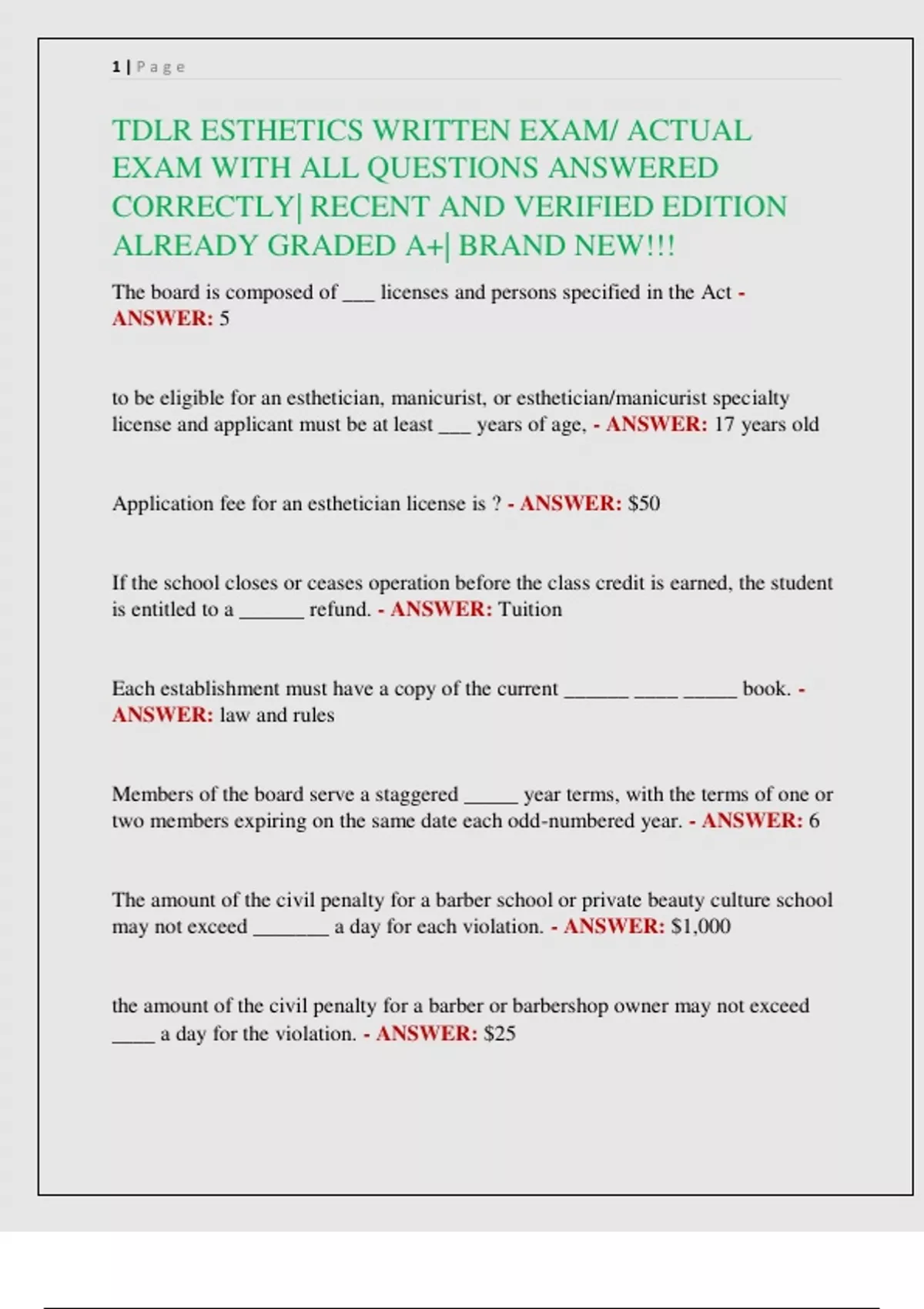 TDLR ESTHETICS WRITTEN EXAM/ ACTUAL EXAM WITH ALL QUESTIONS ANSWERED CORRECTLY| RECENT AND VERIFIED EDITION ALREADY GRADED A+| BRAND NEW!!!