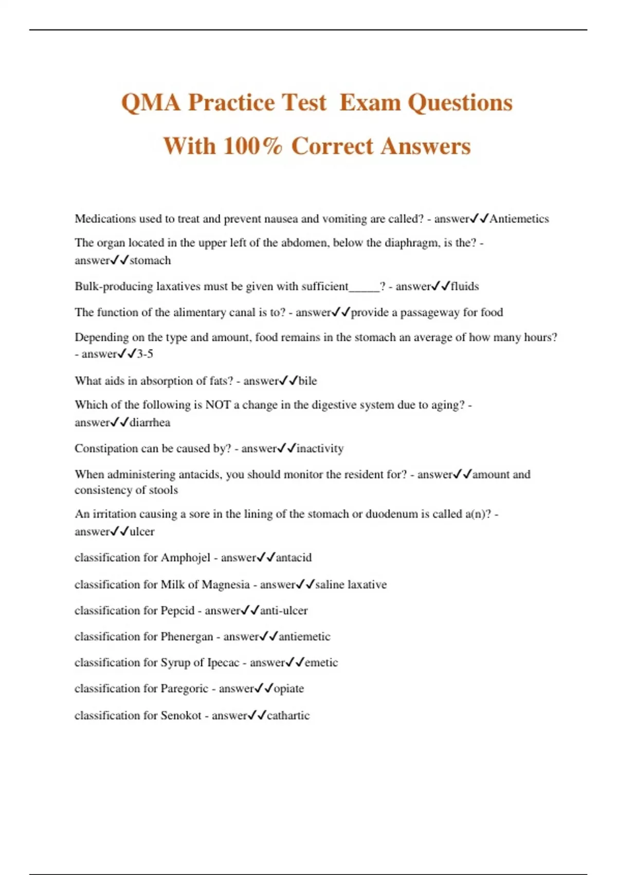 QMA Practice Test Exam Questions With 100% Correct Answers Medications used to treat and prevent nausea and vomiting are called? - answerAntiemetics The organ located in the upper left of the abdomen, below the diaphragm, is the? - answerstomach Bulk-producing laxatives must be given with sufficient_____? - answerfluids The function of the alimentary canal is to? - answerprovide a passageway for food Depending on the type and amount, food remains in the stomach an average of how many hours? - answer3-5 What aids in absorption of fats? - answerbile Which of the following is NOT a change in the digestive system due to aging? - answerdiarrhea Constipation can be caused by? - answerinactivity When administering antacids, you should monitor the resident for? - answeramount and consistency of stools An irritation causing a sore in the lining of the stomach or duodenum is called a(n)? - answerulcer classification for Amphojel - answerantacid