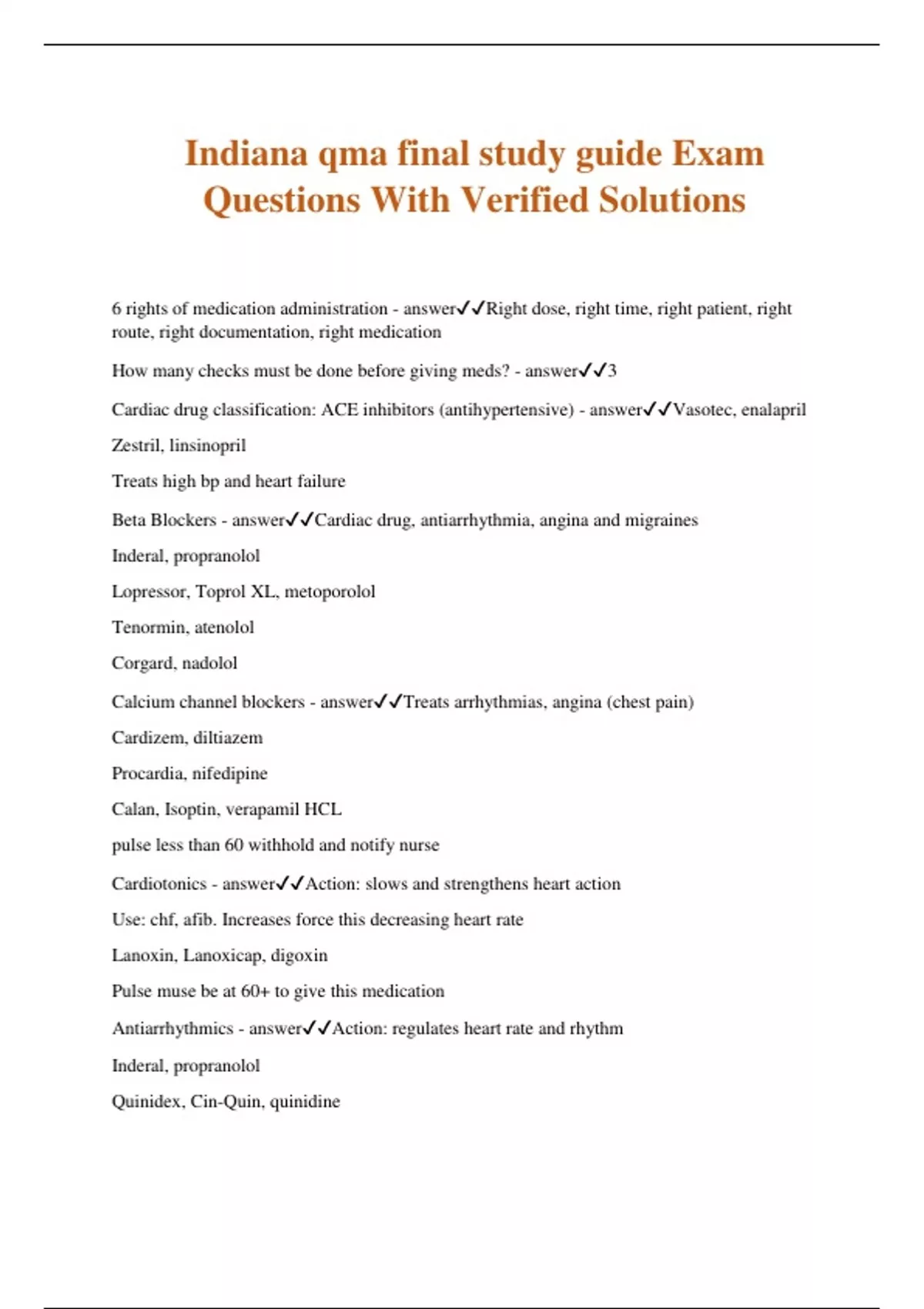 Indiana qma final study guide Exam Questions With Verified Solutions 6 rights of medication administration - answerRight dose, right time, right patient, right route, right documentation, right medication How many checks must be done before giving meds? - answer3 Cardiac drug classification: ACE inhibitors (antihypertensive) - answerVasotec, enalapril Zestril, linsinopril Treats high bp and heart failure Beta Blockers - answerCardiac drug, antiarrhythmia, angina and migraines Inderal, propranolol Lopressor, Toprol XL, metoporolol Tenormin, atenolol Corgard, nadolol Calcium channel blockers - answerTreats arrhythmias, angina (chest pain) Cardizem, diltiazem Procardia, nifedipine Calan, Isoptin, verapamil HCL pulse less than 60 withhold and notify nurse Cardiotonics - answerAction: slows and strengthens heart action Use: chf, afib. Increases force this decreasing heart rate Lanoxin, Lanoxicap, digoxin Pulse muse be at 60+ to give this medication Antiarrhythmics - answerAction: regulates heart rate and rhythm Inderal, propranolol Quinidex, Cin-Quin, quinidine