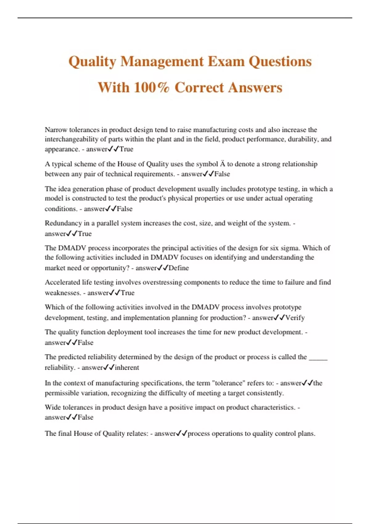 Quality Management Exam Questions With 100% Correct Answers Narrow tolerances in product design tend to raise manufacturing costs and also increase the interchangeability of parts within the plant and in the field, product performance, durability, and appearance. - answerTrue A typical scheme of the House of Quality uses the symbol Ä to denote a strong relationship between any pair of technical requirements. - answerFalse The idea generation phase of product development usually includes prototype testing, in which a model is constructed to test the product's physical properties or use under actual operating conditions. - answerFalse Redundancy in a parallel system increases the cost, size, and weight of the system. - answerTrue The DMADV process incorporates the principal activities of the design for six sigma. Which of the following activities included in DMADV focuses on identifying and understanding the market need or opportunity? - answerDefine Accelerated life testing involves overstressing components to reduce the time to failure and find weaknesses. - answerTrue Which of the following activities involved in the DMADV process involves prototype development, testing, and implementation plan