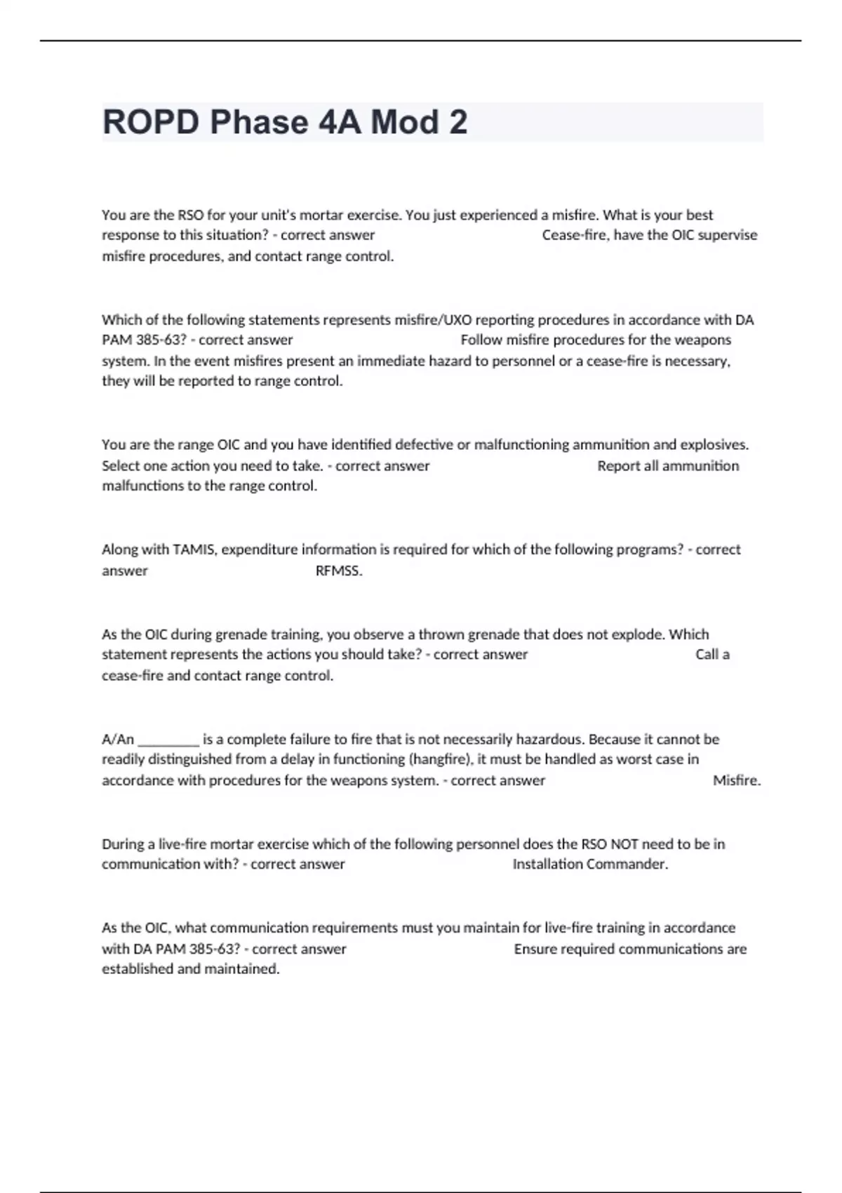 You are the RSO for your unit's mortar exercise. You just experienced a misfire. What is your best response to this situation? - correct answer Cease-fire, have the OIC supervise misfire procedures, and contact range control. Which of the following statements represents misfire/UXO reporting procedures in accordance with DA PAM 385-63? - correct answer Follow misfire procedures for the weapons system. In the event misfires present an immediate hazard to personnel or a cease-fire is necessary, they will be reported to range control. You are the range OIC and you have identified defective or malfunctioning ammunition and explosives. Select one action you need to take. - correct answer Report all ammunition malfunctions to the range control. Along with TAMIS, expenditure information is required for which of the following programs? - correct answer RFMSS. As the OIC during grenade training, you observe a thrown grenade that does not explode. Which statement represents the actions you should take? - correct answer Call a cease-fire and contact range control. A/An ________ is a complete failure to fire that is not necessarily hazardous. Because it cannot be readily distinguished from a delay in functioning (hangfire), it must be handled as worst case in accordance with procedures for the weapons system. - correct answer Misfire. During a live-fire mortar exercise which of the following personnel does the RSO NOT need to be in communication with? - correct answer Installation Commander. As the OIC, what communication requirements must you maintain for live-fire training in accordance with DA PAM 385-63? - correct answer Ensure required communications are established and maintained. You are an RSO for a live-fire mortar exercise. There are several people with whom you need to communicate. You know that you need communications with range control, gate and tower guards, observers, and... - correct answer The OIC. While conducting a live-fire exercise one of your soldiers is hit in the arm by a ricochet fragment and it looks like he will need medical attention. What is the first step in the emergency procedure that you would do? - correct answer Call cease-fire and start first aid as needed. Your live-fire exercise is going as planned when PVT Sanchez yells to tell you that LT Jones has been hit by a ricochet fragment in the face. LT Jones is conscious, but it is clear that he needs emergency medical attention. In this scenario, which of the following general emergency procedures would you NOT perform to get LT Jones treated? - correct answer Move everybody away. What steps are utilized in initiating a response to a medical emergency? - correct answer Call a cease-fire and begin first aid; gain and maintain contact with Range Control. According to AR 385-63, what is the definition of a non-standard item of explosive or ammunition? - correct answer Any explosive or ammunition that has not been accepted and type classified for use by the U.S. military. ________ are the Army publications that provide safety policies, standards, responsibilities, and procedures for implementing and maintaining the U.S. Army Explosives Safety Program. - correct answer AR 385-10 and DA PAM 385-64. In accordance with DA PAM 385-63, select the statement that best represents the requirements when training with live and blank or dummy ammunition. - correct answer Live and blank ammunition will not be stored in, or issued from, the same building at the same time. Which of the following is NOT a commonly used range warning symbol? - correct answer Warning symbol 2 (Yellow caution tape) Range control provided you with a red streamer when you checked out range 7 from machine gun qualifications. When you arrived, you found that your range is equipped with a tower, two forward observation platforms, red limit markers, and a road gate which is the only entrance to the range. The tower has a streamer and a red flashing lights. The observation platform is adjacent to the range and far from foot or vehicle traffic. Which of these areas should be fitted with the red streamer? - correct answer The road gate. What is the purpose of warning signs and signals for range safety? - correct answer Warning signs and signals warn personnel of the risk of entering a range. You are the OIC for an exercise. Lightning strikes close to your range while your unit is firing. This exercise is very important to your unit's overall readiness. The lightning is getting closer, but hasn't stuck the range yet. You cannot control the weather and you need to consider the safety of personnel. Select the best action from the choices below. - correct answer Order a cease-fire, get participants out of danger, an
