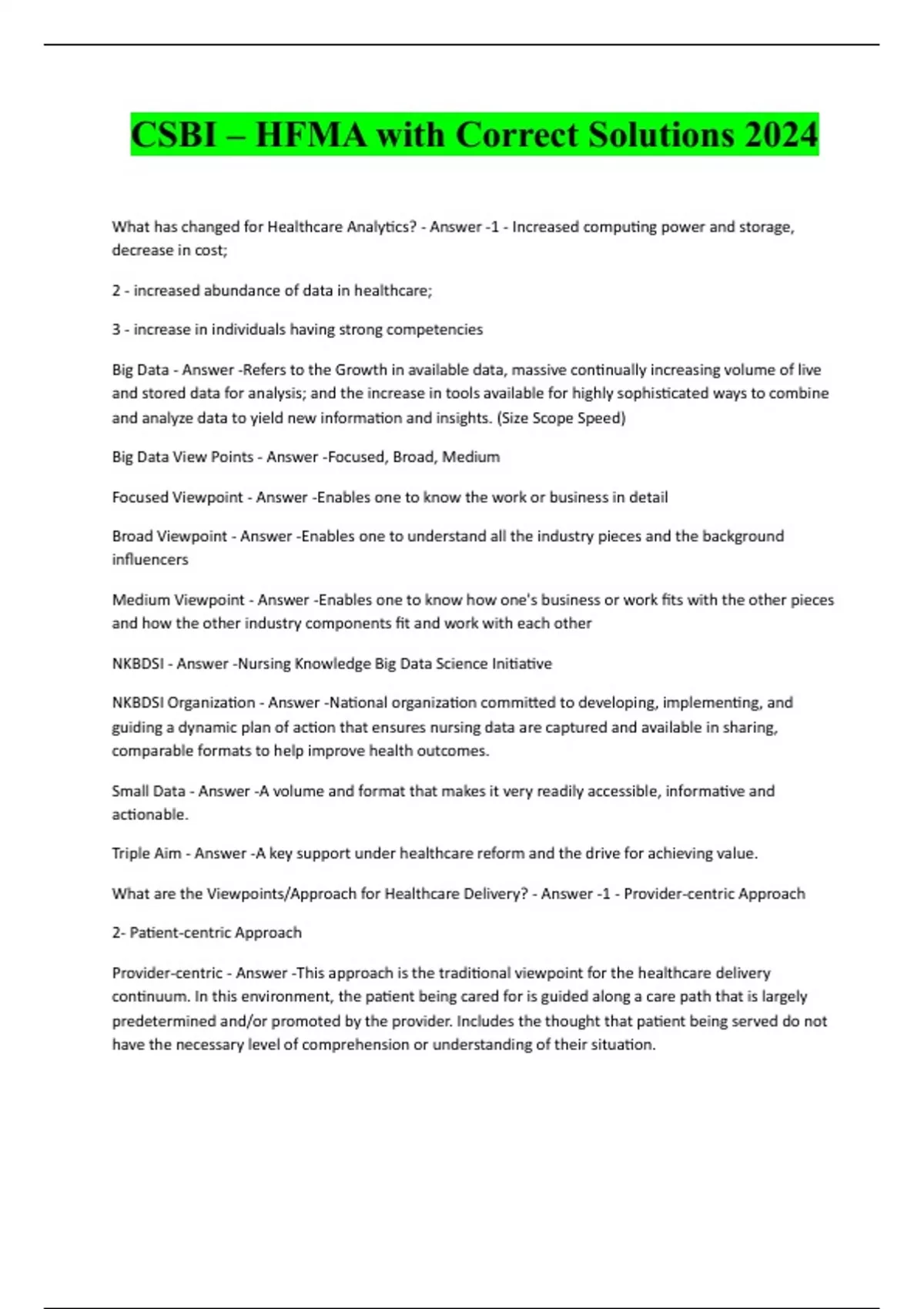 CSBI – HFMA with Correct Solutions 2024 What has changed for Healthcare Analytics? - Answer -1 - Increased computing power and storage, decrease in cost; 2 - increased abundance of data in healthcare; 3 - increase in individuals having strong competencies Big Data - Answer -Refers to the Growth in available data, massive continually increasing volume of live and stored data for analysis; and the increase in tools available for highly sophisticated ways to combine and analyze data to yield new information and insights. (Size Scope Speed) Big Data View Points - Answer -Focused, Broad, Medium Focused Viewpoint - Answer -Enables one to know the work or business in detail Broad Viewpoint - Answer -Enables one to understand all the industry pieces and the background influencers Medium Viewpoint - Answer -Enables one to know how one's business or work fits with the other pieces and how the other industry components fit and work with each other NKBDSI - Answer -Nursing Knowledge Big Data Science Initiative NKBDSI Organization - Answer -National organization committed to developing, implementing, and guiding a dynamic plan of action that ensures nursing data are captured and available in sharing, comparable formats to help improve health outcomes. Small Data - Answer -A volume and format that makes it very readily accessible, informative and actionable. Triple Aim - Answer -A key support under healthcare reform and the drive for achieving value. What are the Viewpoints/Approach for Healthcare Delivery? - Answer -1 - Provider-centric Approach 2- Patient-centric Approach Provider-centric - Answer -This approach is the traditional viewpoint for the healthcare delivery continuum. In this environment, the patient being cared for is guided along a care path that is largely predetermined and/or promoted by the provider. Includes the thought that patient being served do not have the necessary level of comprehension or understanding of their situation.Patient-centric - Answer -The healthcare industry is shifting towards this approach. Based on the patient's condition and prospects for improvement, services are rendered in relation to the situation, as opposed to only considering how an individual progress through a series of facilities. HIPAA Act - Answer -Health Insurance Portability and Accountability Act HITECH Act - Answer -Health Information Technology Economic and Clinical Healt