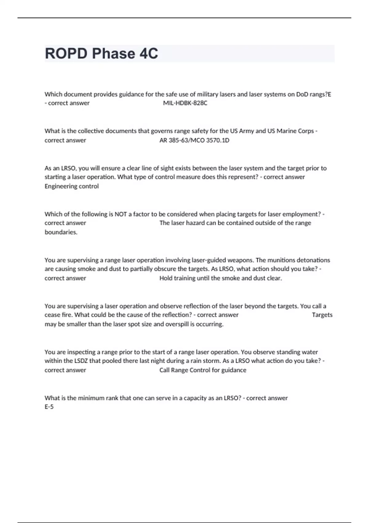 Which document provides guidance for the safe use of military lasers and laser systems on DoD rangs?E - correct answer MIL-HDBK-828C What is the collective documents that governs range safety for the US Army and US Marine Corps - correct answer AR 385-63/MCO 3570.1D As an LRSO, you will ensure a clear line of sight exists between the laser system and the target prior to starting a laser operation. What type of control measure does this represent? - correct answer Engineering control Which of the following is NOT a factor to be considered when placing targets for laser employment? - correct answer The laser hazard can be contained outside of the range boundaries. You are supervising a range laser operation involving laser-guided weapons. The munitions detonations are causing smoke and dust to partially obscure the targets. As LRSO, what action should you take? - correct answer Hold training until the smoke and dust clear. You are supervising a laser operation and observe reflection of the laser beyond the targets. You call a cease fire. What could be the cause of the reflection? - correct answer Targets may be smaller than the laser spot size and overspill is occurring. You are inspecting a range prior to the start of a range laser operation. You observe standing water within the LSDZ that pooled there last night during a rain storm. As a LRSO what action do you take? - correct answer Call Range Control for guidance What is the minimum rank that one can serve in a capacity as an LRSO? - correct answer E-5 Which of the following is NOT a responsibility of an LRSO as part of conducting range laser safety inspection? - correct answer Post laser warning signs in accordance with DA PAM 385-63. During a laser operation, as an LRSO you are responsible for ensuring energized lasers are oriented correctly. Hoe should lasers be oriented? - correct answer Lasers are pointed towards the targets. Which class of laser system is considered safe if handled carefully, with restricted viewing? - correct answer Class 3R What does the "M" designator indicate when associated with a class of laser system? (Example: Class 1M) - correct answer Hazardous when viewed with magnifying optics What is the principle hazard associated with exposure to laser radiation? - correct answer Eye damage What type of laser application uses a bright light to cause visual field obscuration in a targeted individuals and is intended to primarily a warning device? - correct answer Ocular Interruption Lasers are used for a variety of military applications. What type of laser application uses a laser primarily as a warning device? - correct answer Ocular Interruption Which of the following could produce a specular reflection from a laser? - correct answer Calm water What type of laser application uses a laser to point out the location of a target? - correct answer Laser marking Which of the following surfaces most likely would produce a diffuse reflection from a laser? - correct answer Dry foliage A diffuse reflection differs from a specular reflection. Which o the following statements is NOT true regarding diffuse reflection? - correct answer A diffuse reflection produces a concentrated beam that allows the seeker to lock on. What class of laser system is hazardous to personnel viewing the source directly or by specular reflection, but do not present a diffuse reflection or skin hazard? - correct answer Class 3B What class of laser system can present a potential diffuse reflection hazard and a skin or fire hazard? - correct answer Class 4 You are serving as LRSO for a range laser operation. You have certain duties pertaining to the LSDZ. Which of the following actions must you ensure? - correct answer LEP is worn inside the LSDZ. True or False? You will never be assigned as an RSO and LRSO during the same operation. - correct answer False Which of the following items that may be found in a target area can produce specular reflections and must be removed prior to a laser operation? Select all that apply... - correct answer Still Water, Window, Chrome-plated Metal You are serving as LRSO to supervise a range laser operation. What types of incidents would require you to cease laser operations? - correct answer Specular reflection present Smoke and dust obscure targets Traffic enters the LSDZ Poor tracking is observed What is the optimal attack path for an aircraft when employing laser-guided air-to-ground weapons? - correct answer The optimal attack zone is inside a 120-degree cone whose apex is at the target and extends to 60 degrees on either side of the target-to-laser designator line and is outside the 20 degree exclusion zone, both laterally and vertically. You are looking to reduce risks to personnel, and you are looking at the different road blocks and gates around the range. Which type of control measure does this fall in? - correct answer Administrative control measures You are supervising a range laser operation that calls for employment of rifles with the AN/PEQ-15 Advanced Target Pointer Illuminator Aiming Light (ATPIAL). The unit shows up with the AN/PEQ-16A Mini-Integrated Pointer Illuminator Module (MIPIM), which personnel tell you is "the same thing". Are the laser systems brought to the range authorized? - correct answer No. Even though they fall into the same laser classification, the range request identified the ATPIAL. You are preparing a three-part safety/pre-mission brief for an upcoming training exercise. For part one, under the category of Laser TM, which reference will you use to gather the information you need? - correct answer Laser systems information For part three, under the category of DA PAM 385-63, which reference will you use to gather the information you need? - correct answer Laser safety considerations For part two, under the category of Range Request/Range SOP, which references will you use to gather the information you need? - correct answer Mission profile, authorized targets, PPE What is the defin