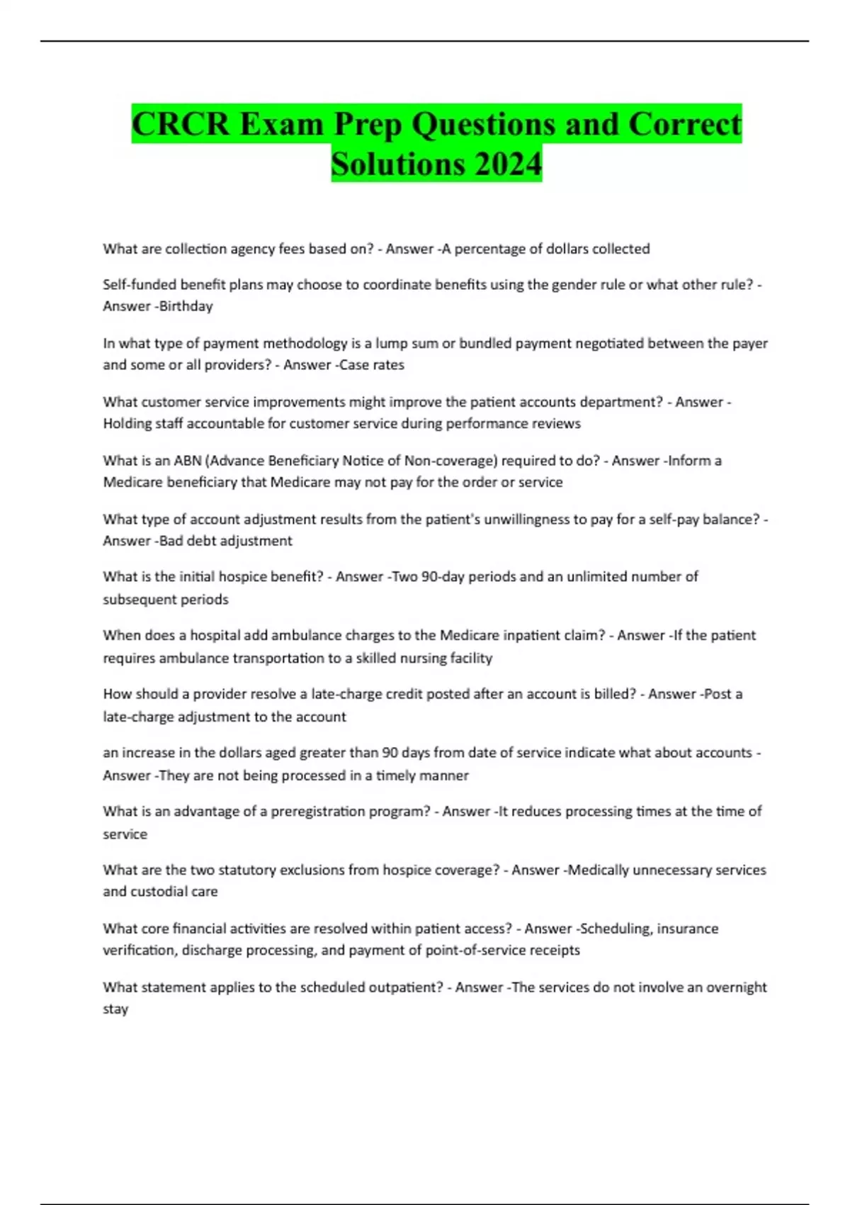 CRCR Exam Prep Questions and Correct Solutions 2024 What are collection agency fees based on? - Answer -A percentage of dollars collected Self-funded benefit plans may choose to coordinate benefits using the gender rule or what other rule? - Answer -Birthday In what type of payment methodology is a lump sum or bundled payment negotiated between the payer and some or all providers? - Answer -Case rates What customer service improvements might improve the patient accounts department? - Answer - Holding staff accountable for customer service during performance reviews What is an ABN (Advance Beneficiary Notice of Non-coverage) required to do? - Answer -Inform a Medicare beneficiary that Medicare may not pay for the order or service What type of account adjustment results from the patient's unwillingness to pay for a self-pay balance? - Answer -Bad debt adjustment What is the initial hospice benefit? - Answer -Two 90-day periods and an unlimited number of subsequent periods When does a hospital add ambulance charges to the Medicare inpatient claim? - Answer -If the patient requires ambulance transportation to a skilled nursing facility How should a provider resolve a late-charge credit posted after an account is billed? - Answer -Post a late-charge adjustment to the account an increase in the dollars aged greater than 90 days from date of service indicate what about accounts - Answer -They are not being processed in a timely manner What is an advantage of a preregistration program? - Answer -It reduces processing times at the time of service What are the two statutory exclusions from hospice coverage? - Answer -Medically unnecessary services and custodial care What core financial activities are resolved within patient access? - Answer -Scheduling, insurance verification, discharge processing, and payment of point-of-service receipts What statement applies to the scheduled outpatient? - Answer -The services do not involve an overnight stayHow is a mis-posted contractual allowance resolved? - Answer -Comparing the contract reimbursement rates with the contract on the admittance advice to identify the correct amount What type of patient status is used to evaluate the patient's need for inpatient care? - Answer - Observation Coverage rules for Medicare beneficiaries receiving skilled nursing care require that the beneficiary has received what? - Answer -Medically necessary inpatient hospital services for at least 3 consecutive days before the skilled nursing care admission When is the word "SAME" entered on the CMS 1500 billing form in Field 0$? - Answer -When the patient is the insured What are non-emergency patients who come for service without prior notification to the provider called? - Answer -Unscheduled patients If the insurance verification response reports that a subscriber has a single policy, what is the status o