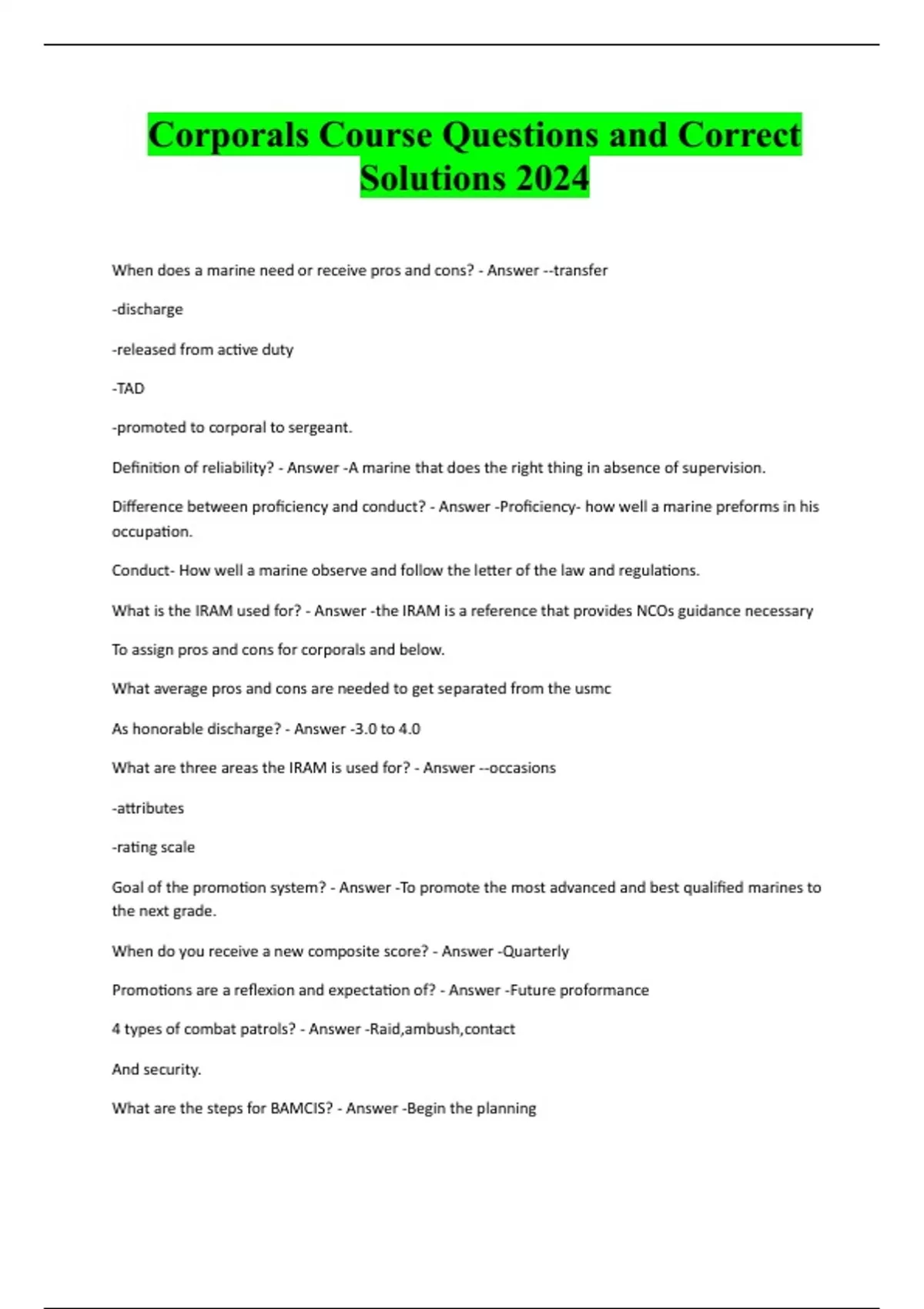 Corporals Course Questions and Correct Solutions 2024 When does a marine need or receive pros and cons? - Answer --transfer -discharge -released from active duty -TAD -promoted to corporal to sergeant. Definition of reliability? - Answer -A marine that does the right thing in absence of supervision. Difference between proficiency and conduct? - Answer -Proficiency- how well a marine preforms in his occupation. Conduct- How well a marine observe and follow the letter of the law and regulations. What is the IRAM used for? - Answer -the IRAM is a reference that provides NCOs guidance necessary To assign pros and cons for corporals and below. What average pros and cons are needed to get separated from the usmc As honorable discharge? - Answer -3.0 to 4.0 What are three areas the IRAM is used for? - Answer --occasions -attributes -rating scale Goal of the promotion system? - Answer -To promote the most advanced and best qualified marines to the next grade. When do you receive a new composite score? - Answer -Quarterly Promotions are a reflexion and expectation of? - Answer -Future proformance 4 types of combat patrols? - Answer -Raid,ambush,contact