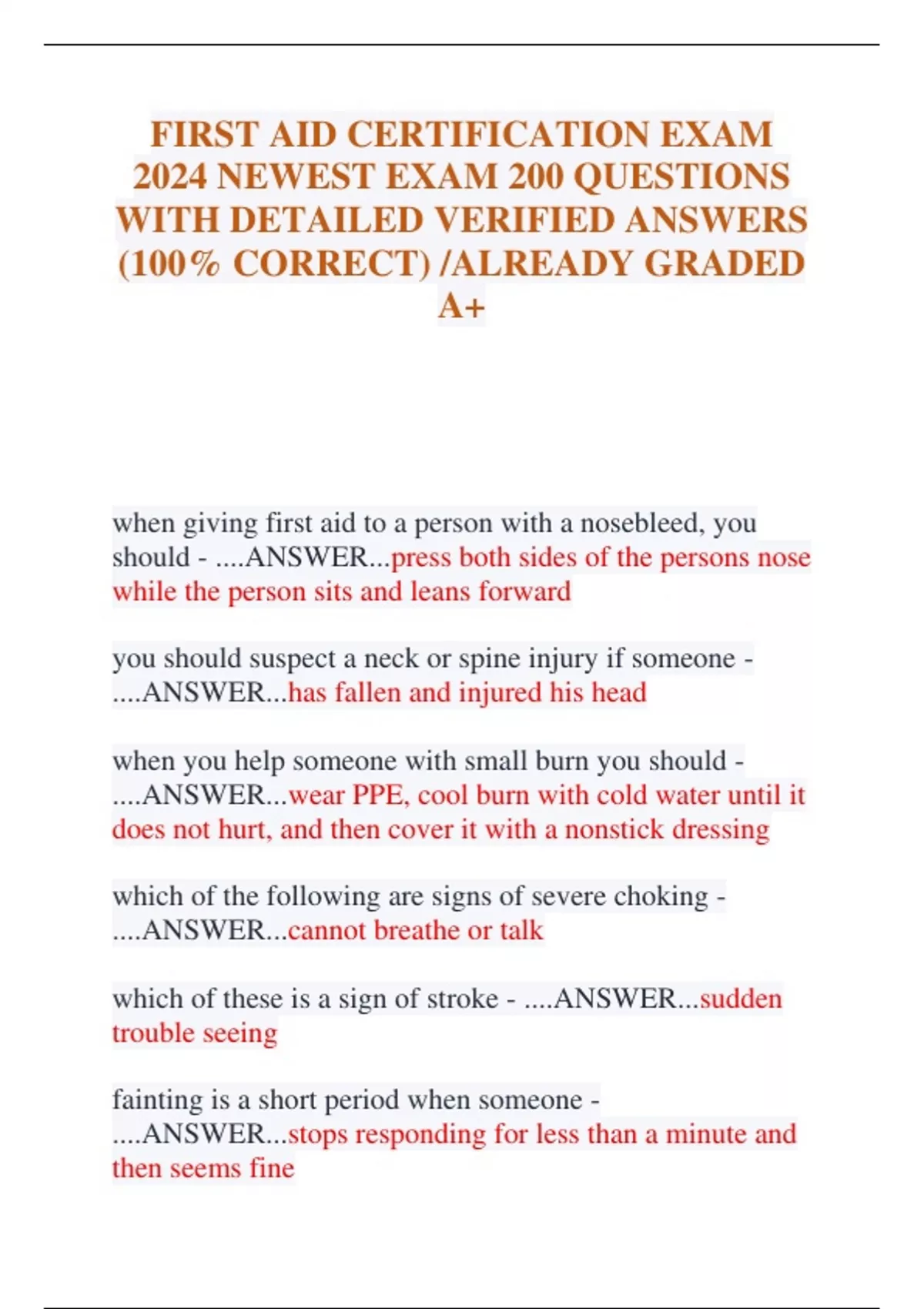 FIRST AID CERTIFICATION EXAM 2024 NEWEST EXAM 200 QUESTIONS WITH DETAILED VERIFIED ANSWERS (100% CORRECT) /ALREADY GRADED A+