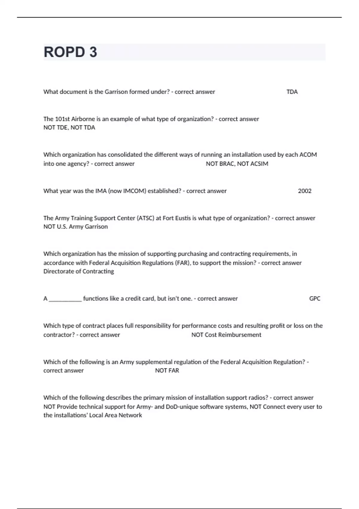 What document is the Garrison formed under? - correct answer TDA The 101st Airborne is an example of what type of organization? - correct answer NOT TDE, NOT TDA Which organization has consolidated the different ways of running an installation used by each ACOM into one agency? - correct answer NOT BRAC, NOT ACSIM What year was the IMA (now IMCOM) established? - correct answer 2002 The Army Training Support Center (ATSC) at Fort Eustis is what type of organization? - correct answer NOT U.S. Army Garrison Which organization has the mission of supporting purchasing and contracting requirements, in accordance with Federal Acquisition Regulations (FAR), to support the mission? - correct answer Directorate of Contracting A __________ functions like a credit card, but isn't one. - correct answer GPC Which type of contract places full responsibility for performance costs and resulting profit or loss on the contractor? - correct answer NOT Cost Reimbursement Which of the following is an Army supplemental regulation of the Federal Acquisition Regulation? - correct answer NOT FAR Which of the following describes the primary mission of installation support radios? - correct answer NOT Provide technical support for Army- and DoD-unique software systems, NOT Connect every user to the installations' Local Area Network Which directorate is responsible for storage of old paper and electronic files generated in the process of managing training ranges? - correct answer NOT DOL, NOT DPTMS Which mission of the DOL provides maintenance support for tactical vehicles, weapon and fire control systems, special purpose equipment, and aircraft? - correct answer NOT Transportation Which class of supply includes explosives? - correct answer Class V Which directorate has the responsibility of determining the type of ranges to accomplish the individual and unit training required to support the units assigned to the installation, to include the Reserve Component (Army Reserve and Army National Guard) w - correct answer NOT Directorate of Planning, Training, Mobilization, and Security, NOT Directorate of Logistics What are the three divisions of the DPTMS? - correct answer NOT Range, Support, Training, NOT Mobilization and Reserve Affairs, Training, Support Airspace management is a task of which DPTMS division? - correct answer NOT Mobilization Division Which of the following is NOT a task of the Range Office? - correct answer Direct support and general support maintenance for tactical vehicles, weapons, and fire control systems, special purpose equipment and aircraft that may be used on the range Which of the following provides overall supervision of the range organization to develop and implement the installation range program for the commander? - correct answer NOT DPTMS Which of the following is NOT an element of the Range certification? - correct answer NOT The Range Office gives each Range OIC and RSO a range safety briefing in the use of the training complex. Firing on a range can only begin after this office grants approval. Which task of the Range Office designates who has access to high hazard impact areas? - correct answer Range Access Which Army regulation series deals with Army training? - correct answer AR 350 Series Which of the following phrases best describes Supporting Tenets? - correct answer NOT Contributes neither to the primary mission nor the support function of the installation Which type of contract tailors the profit in contract performance to the uncertainties involved and the contractor's ability to control performance cost? - correct answer NOT IDIQ Which of the following is a DoD supplemental regulation of the Federal Acquisition Regulation? - correct answer DFAR Which mission of the Director of Logistics involves the supply of organizational clothing and individual equipment? - correct answer NOT Arming Which division of the DPTMS is responsible for planning for the support or employment of forces assigned for CONUS contingencies? - correct answer Mobilization and Reserve Affairs Division Which mission of the Range Office develops an Integrated Solid Waste Management Plan which assigns responsibilities and establishes positive control on waste? - correct answer Environmental Monitoring Which Range Office mission is responsible for overseeing and enforcing the Spill Prevention, Control and Countermeasure Plan? - correct answer Environmental Monitoring Which of the following is NOT a governing regulation for range control? - correct answer NOT AR 210-20 Which organization is responsible for the system for collecting and distributing mail to tenets and organizations on the installation? - correct answer Network Enterprise Center Which organization provides oversight on IT support for military construction (MILCON) to make sure the resulting construction has built-in IT infrastructure that supports the user's mission? - correct answer Network Enterprise Center How is the Garrison Commander selected for command? - correct answer NOT Appointed by the Secretary of Defense The Installation Management Agency is an example of what type of organization? - correct answer NOT TOA The __________ has the responsibility to establish policy and distribute funding for the operation and maintenance of the installations, and manage installations in support of the installations' tactical mission. - correct answer IMCOM The Army Training Support Center (ATSC) at Fort Eustis is what type of organization? - correct answer NOT Mission Element __________ are a simplified method of filling anticipated repetitive needs for services and products. - correct answer NOT GSAs Which of the following is a primary mission of the Network Enterprise Center? - correct answer NOT Support of range computer information systems Which mission of the DOL is responsible for supplying Army tactical units with weapon systems and ammunition? - correct answer Arming Which class of supply includes bandages? - correct answer Class VIII Whic