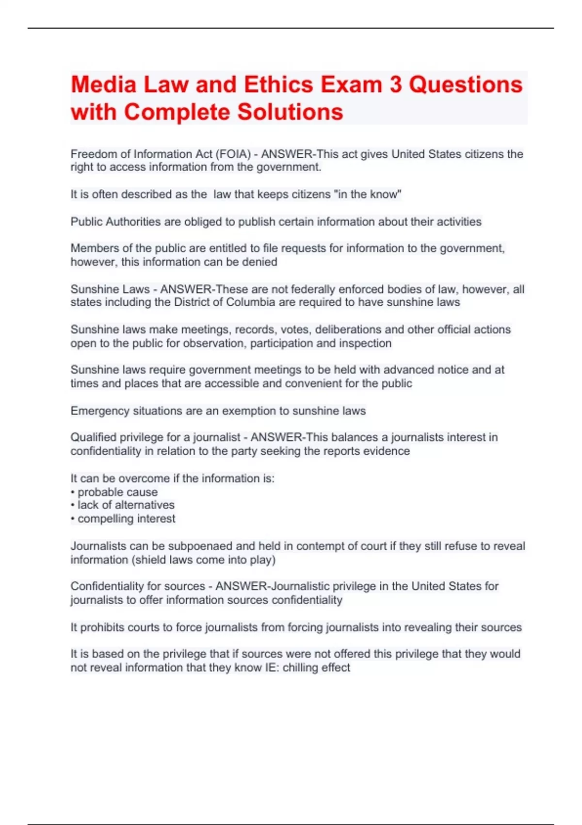 Freedom of Information Act (FOIA) - ANSWER-This act gives United States citizens the right to access information from the government. It is often described as the law that keeps citizens "in the know" Public Authorities are obliged to publish certain information about their activities Members of the public are entitled to file requests for information to the government, however, this information can be denied Sunshine Laws - ANSWER-These are not federally enforced bodies of law, however, all states including the District of Columbia are required to have sunshine laws Sunshine laws make meetings, records, votes, deliberations and other official actions open to the public for observation, participation and inspection Sunshine laws require government meetings to be held with advanced notice and at times and places that are accessible and convenient for the public Emergency situations are an exemption to sunshine laws Qualified privilege for a journalist - ANSWER-This balances a journalists interest in confidentiality in relation to the party seeking the reports evidence It can be overcome if the information is: • probable cause • lack of alternatives • compelling interest Journalists can be subpoenaed and held in contempt of court if they still refuse to reveal information (shield laws come into play) Confidentiality for sources - ANSWER-Journalistic privilege in the United States for journalists to offer information sources confidentiality It prohibits courts to force journalists from forcing journalists into revealing their sources It is based on the privilege that if sources were not offered this privilege that they would not reveal information that they know IE: chilling effect