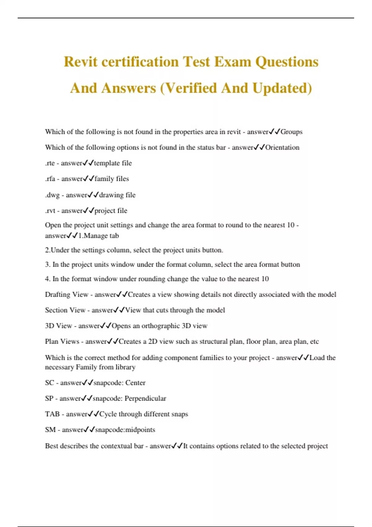 Revit certification Test Exam Questions And Answers (Verified And Updated) Which of the following is not found in the properties area in revit - answerGroups Which of the following options is not found in the status bar - answerOrientation .rte - answertemplate file .rfa - answerfamily files .dwg - answerdrawing file .rvt - answerproject file Open the project unit settings and change the area format to round to the nearest 10 - answer1.Manage tab 2.Under the settings column, select the project units button. 3. In the project units window under the format column, select the area format button 4. In the format window under rounding change the value to the nearest 10 Drafting View - answerCreates a view showing details not directly associated with the model Section View - answerView that cu