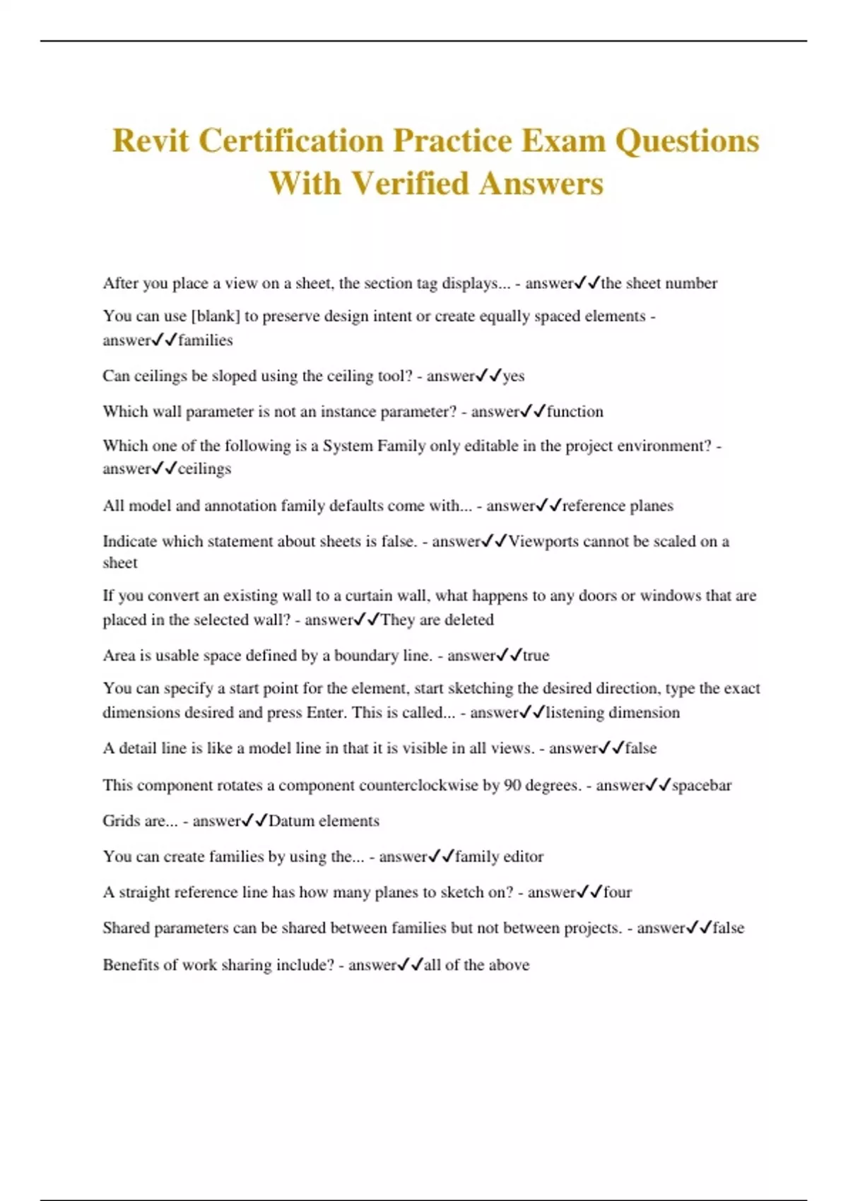 Revit Certification Practice Exam Questions With Verified Answers After you place a view on a sheet, the section tag displays... - answerthe sheet number You can use [blank] to preserve design intent or create equally spaced elements - answerfamilies Can ceilings be sloped using the ceiling tool? - answeryes Which wall parameter is not an instance parameter? - answerfunction Which one of the following is a System Family only editable in the project environment? - answerceilings All model and annotation family defaults come with... - answerreference planes Indicate which statement about sheets is false. - answerViewports cannot be scaled on a sheet If you convert an existing wall to a curtain wall, what happens to any doors or windows that are placed in the selected wall? - answerThey are deleted Area is usable space defined by a boundary line. - answertrue You can specify a start point for the element, start sketching the desired direction, type the exact dimensions desired and pres