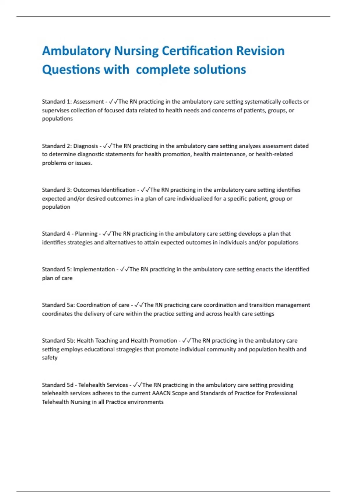 Ambulatory Nursing Certification Revision Questions with complete solutions Standard 1: Assessment - The RN practicing in the ambulatory care setting systematically collects or supervises collection of focused data related to health needs and concerns of patients, groups, or populations Standard 2: Diagnosis - The RN practicing in the ambulatory care setting analyzes assessment dated to determine diagnostic statements for health promotion, health maintenance, or health-related problems or issues. Standard 3: Outcomes Identification - The RN practicing in the ambulatory care setting identifies expected and/or desired outcomes in a plan of care individualized for a specific patient, group or population Standard 4 - Planning - The RN practicing in the ambulatory care setting develops a plan that identifies strategies and alternatives to attain expected outcomes in individuals and/or populations Standard 5: Implementation - The RN practicing in the ambulatory care setting enacts the identified plan of care Standard 5a: Coordination of care - The RN practicing care coordination and transition management coordinates the delivery of care within the practice setting and across health care settings Standard 5b: Health Teaching and Health Promotion - The RN practicing in the ambulatory care setting employs educational stragegies that promote individual community and population health and safety Standard 5d - Telehealth Services - The RN practicing in the ambulatory care setting providing telehealth services adheres to the current AAACN Scope and Standards of Practice for Professional Telehealth Nursing in all Practice environments Standard 5d: Consultation - The RN practicing in the ambulatory care setting provides consultation developing interprofessional plans of care, enhancing the ability of other professionals and effecting change Standard 6: Evaluation - The RN practicing in the ambulatory care setting evaluates progress toward attainment of stated outcomes Standard 7: Ethics - The RN practicing in the ambulatory care setting incorporates professional codes of ethics with compassion and respect for the inherent dignity, worth, and unique attributes of every person Standard 8: Education - The RN practicing in the ambulatory care setting attains knowledge and competency that reflects current ambulatory nursing care practice Standard 9: Research and Evidence-Based Practice - The RN practicing in the ambulatory care setting actively participates in evidence-based practice initiatives and research activities to advance ambulatory care nursing and improve patient outcomes Standard 10: Performance Improvement - The RN practicing in the ambulatory care setting enhances the quality, efficiency, and effectiveness of clinical and professional nursing practice and organizational system Standard 11: Communication - The RN practicing in the ambulatory care setting communicates effectively using a variety of formats, tools, and technologies to build professional relationships and deliver care across the continuum Standard 12: Leadership - The RN practicing in the ambulatory care setting demonstrates leadership behaviors in practice settings, across the profession, and in the community Standard 13: Collaboration - The RN prac
