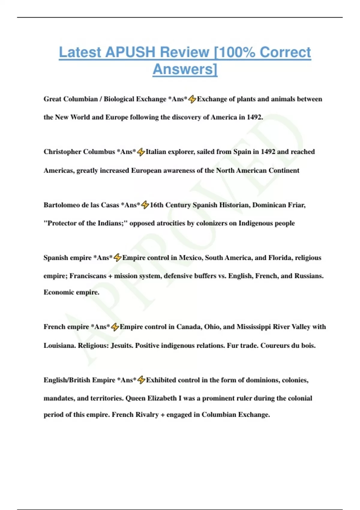 Latest AP US History Exam Review |100% Correct| Chapter 3: Discovering and Settling the New World *Ans* ... John Calvin *Ans* French humanist whose theological writings profoundly influenced religious thoughts of Europeans. Developed Calvinism at Geneva. Wrote Institutes of Christian Religion Martin Luther *Ans* a German monk who became one of the most famous critics of the Roman Catholic Chruch. In 1517, he wrote 95 theses, or statements of belief attacking the church practices. John Smith *Ans* ..., Helped found and govern Jamestown. His leadership and strict discipline helped the Virginia colony get through the difficult first winter. Protestant Reformation *Ans* ..., a religious movement of the 16th century that began as an attempt to reform the Roman Catholic Church and resulted in the creation of Protestant churches Treaty of Tordesillas *Ans* ..., Set the Line of Demarcation which was a boundary established in 1493 to define Spanish and Portuguese possessions in the Americas. Roanoke *Ans* ..., Established in 1587. Called the Lost Colony. It was financed by Sir Walter Raleigh, and its leader in the New World was John White. All the settlers disappeared, and historians still don't know what became of them. Virginia Company *Ans* ..., Joint-stock company chartered by King James I of England; established the first permanent English colony in America at Jamestown in 1607. elect *Ans* ..., in Calvinist doctrine, those who have been chosen by God for salvation. encomienda *Ans* ..., a grant of land made by Spain to a settler in the Americas, including the right to use Native Americans as laborers on it Chapter 4: The Atlantic World *Ans* ... John Winthrop *Ans* ..., Puritan Governor of Massachusetts Bay Colony, envisioned colony as a "city upon a hill" Anne Hutchinson *Ans* ..., She preached the idea that God communicated directly to individuals instead of through the church elders. She was forced to leave Massachusetts in 1637. Her followers (the Antinomianists) founded the colony of New Hampshire in 1639. Roger Williams *Ans* ..., He founded Rhode Island for separation of Church and State. He believed that the Puritans were too powerful and was ordered to leave the Massachusetts Bay Colony for his religious belief