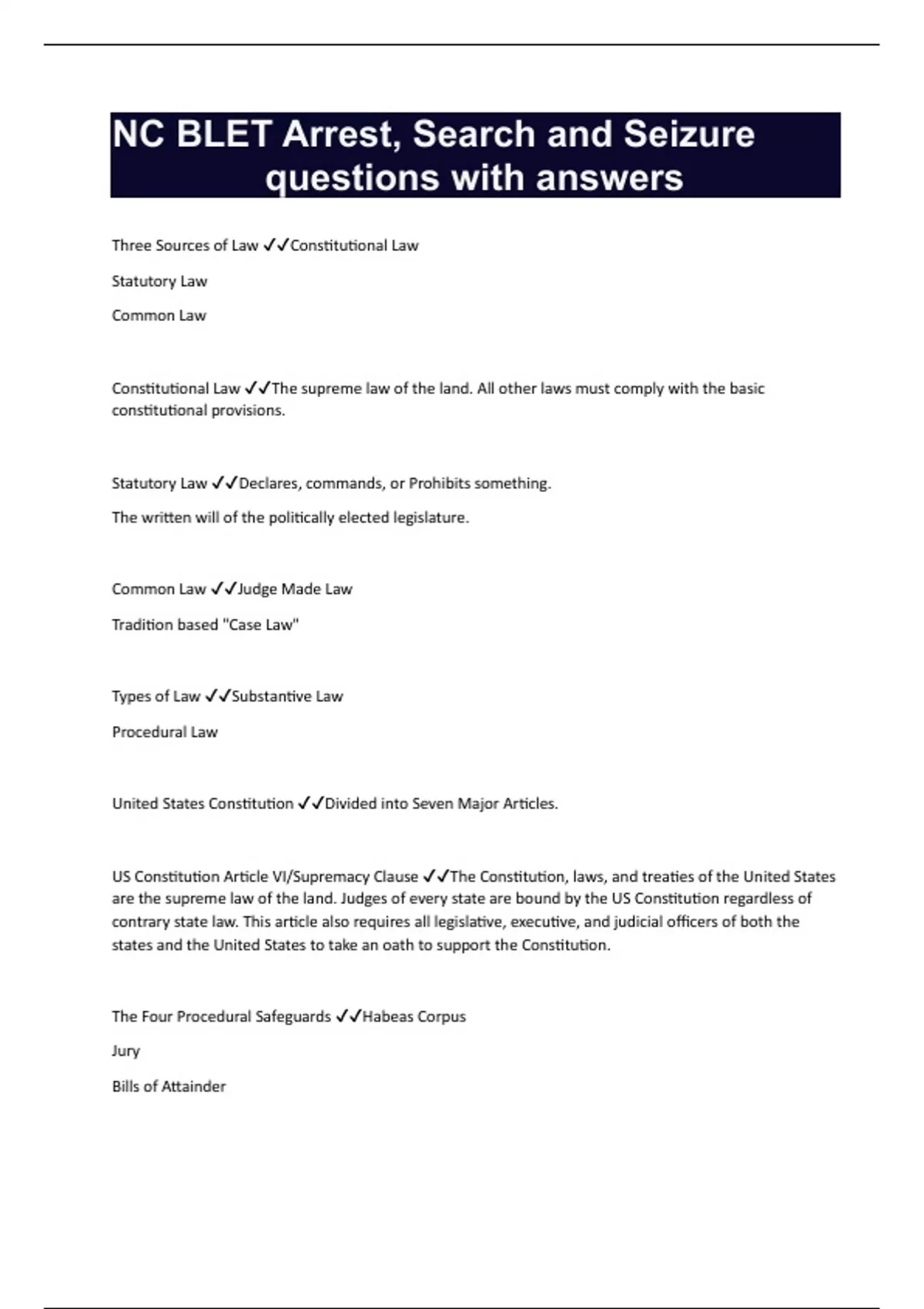 Three Sources of Law Constitutional Law Statutory Law Common Law Constitutional Law The supreme law of the land. All other laws must comply with the basic constitutional provisions. Statutory Law Declares, commands, or Prohibits something. The written will of the politically elected legislature. Common Law Judge Made Law Tradition based "Case Law" Types of Law Substantive Law Procedural Law United States Constitution Divided into Seven Major Articles. US Constitution Article VI/Supremacy Clause The Constitution, laws, and treaties of the United States are the supreme law of the land. Judges of every state are bound by the US Constitution regardless of contrary state law. This article also requires all legislative, executive, and judicial officers of both the states and the United States to take an oath to support the Constitution. The Four Procedural Safeguards Habeas Corpus Jury Bills of Attainder