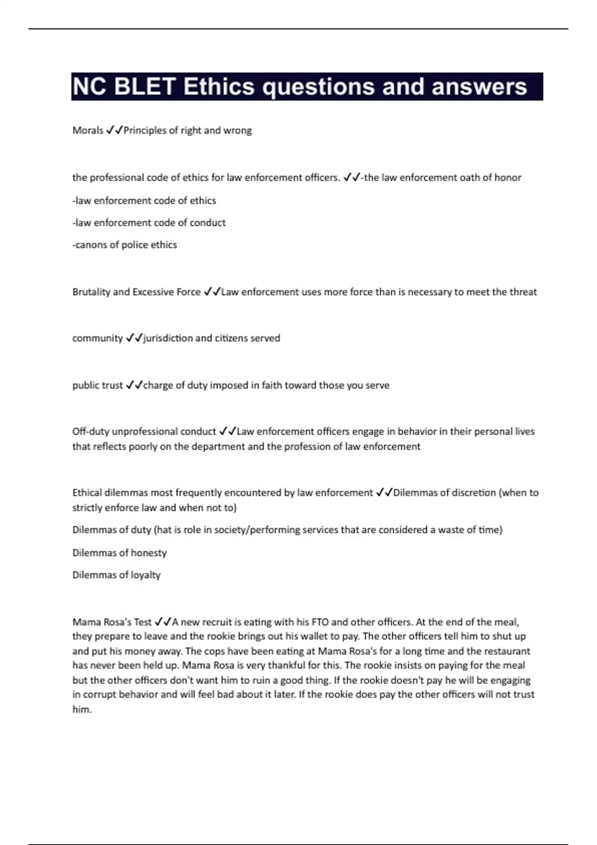 Morals Principles of right and wrong the professional code of ethics for law enforcement officers. -the law enforcement oath of honor -law enforcement code of ethics -law enforcement code of conduct -canons of police ethics Brutality and Excessive Force Law enforcement uses more force than is necessary to meet the threat community jurisdiction and citizens served public trust charge of duty imposed in faith toward those you serve Off-duty unprofessional conduct Law enforcement officers engage in behavior in their personal lives that reflects poorly on the department and the profession of law enforcement Ethical dilemmas most frequently encountered by law enforcement Dilemmas of discretion (when to strictly enforce law and when not to) Dilemmas of duty (hat is role in society/performing services that are considered a waste of time) Dilemmas of honesty Dilemmas of loyalty Mama Rosa's Test A new recruit is eating with his FTO and other officers. At the end of the meal, they prepare to leave and the rookie brings out his wallet to pay. The other officers tell him to shut up and put his money away. The cops have been eating at Mama Rosa's for a long time and the restaurant has never been held up. Mama Rosa is very thankful for this. The rookie insists on paying for the meal but the other officers don't want him to ruin a good thing. If the rookie doesn't pay he will be engaging in corrupt behavior and will feel bad about it later. If the rookie does pay the other officers will not trust him.