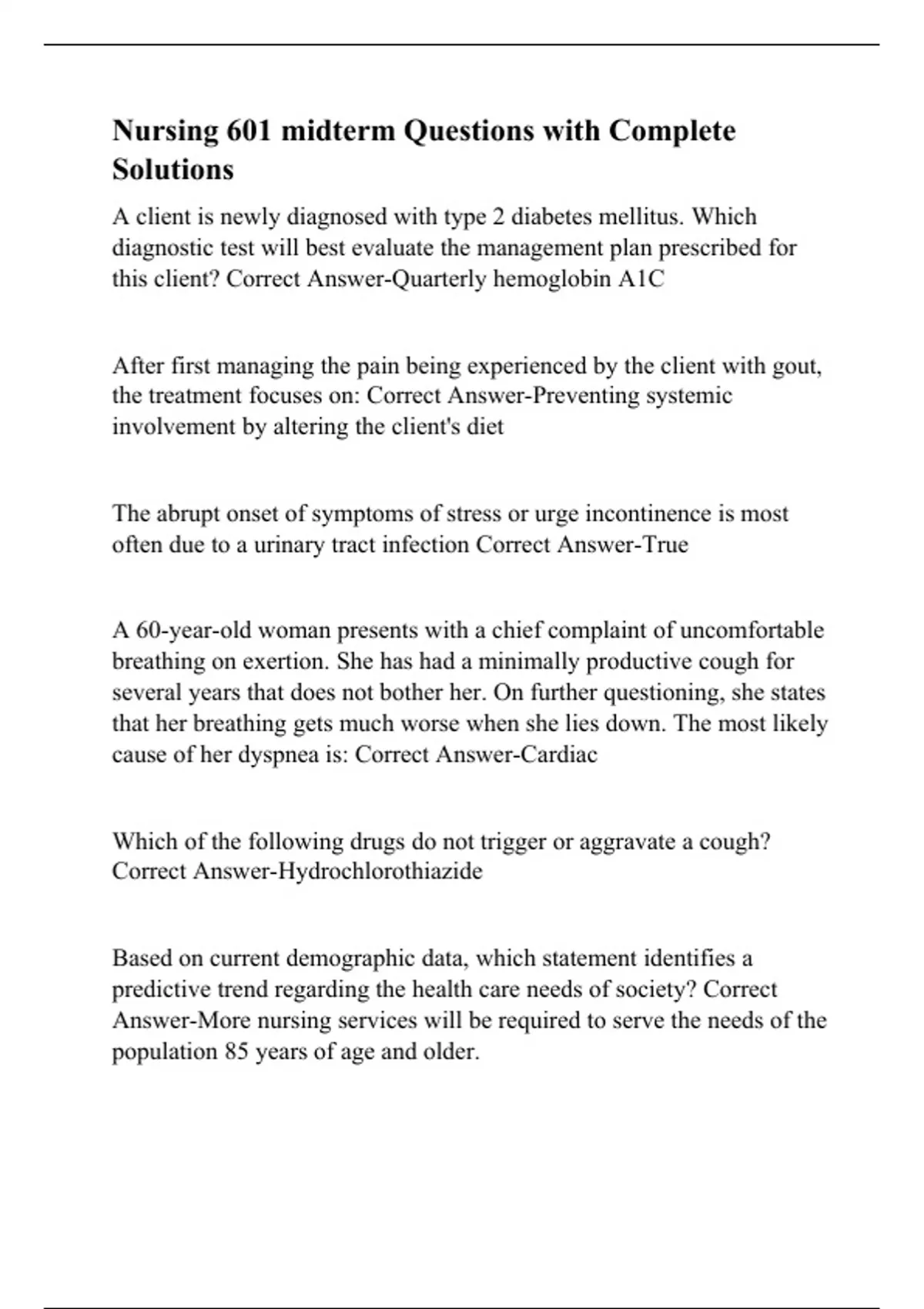 A client is newly diagnosed with type 2 diabetes mellitus. Which diagnostic test will best evaluate the management plan prescribed for this client? Correct Answer-Quarterly hemoglobin A1C After first managing the pain being experienced by the client with gout, the treatment focuses on: Correct Answer-Preventing systemic involvement by altering the client's diet The abrupt onset of symptoms of stress or urge incontinence is most often due to a urinary tract infection Correct Answer-True A 60-year-old woman presents with a chief complaint of uncomfortable breathing on exertion. She has had a minimally productive cough for several years that does not bother her. On further questioning, she states that her breathing gets much worse when she lies down. The most likely cause of her dyspnea is: Correct Answer-Cardiac Which of the following drugs do not trigger or aggravate a cough? Correct Answer-Hydrochlorothiazide Based on current demographic data, which statement identifies a predictive trend regarding the health care needs of society? Correct Answer-More nursing services will be required to serve the needs of the population 85 years of age and older. Which diagnostic laboratory test would th