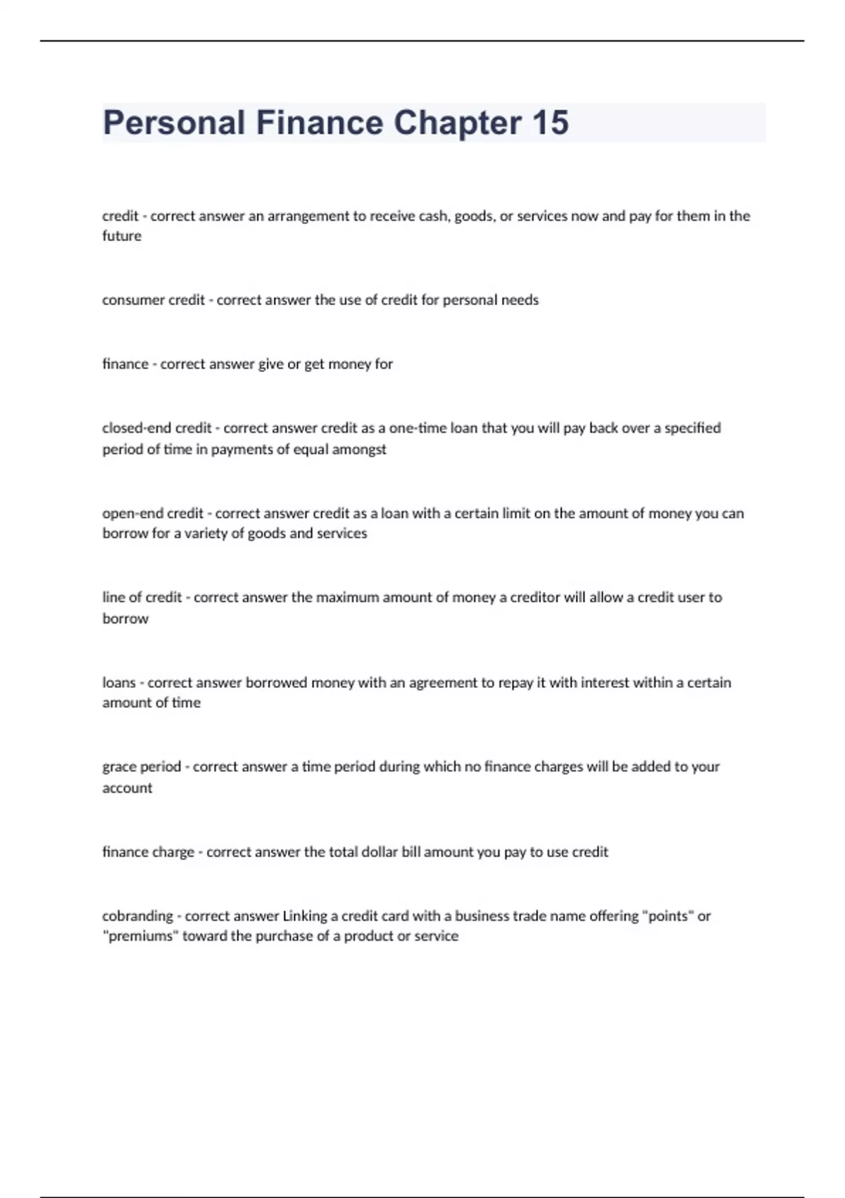 Personal Finance Chapter 15 Exam Questions Correctly Answered. credit - correct answer an arrangement to receive cash, goods, or services now and pay for them in the future consumer credit - correct answer the use of credit for personal needs finance - correct answer give or get money for closed-end credit - correct answer credit as a one-time loan that you will pay back over a specified period of time in payments of equal amongst open-end credit - correct answer credit as a loan with a certain limit on the amount of money you can borrow for a variety of goods and services line of credit - correct answer the maximum amount of money a creditor will allow a credit user to borrow loans - correct answer borrowed money with an agreement to repay it with interest within a certain amount of time grace period - correct answer a time period during which no finance charges will be added to your account finance charge - correct answer the total dollar bill amount you pay to use credit cobranding - correct answer Linking a credit card with a business trade name offering "points" or "premiums" toward the purchase of a product or service